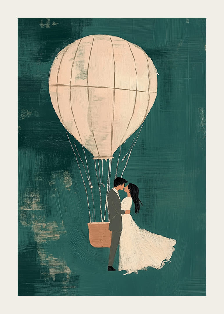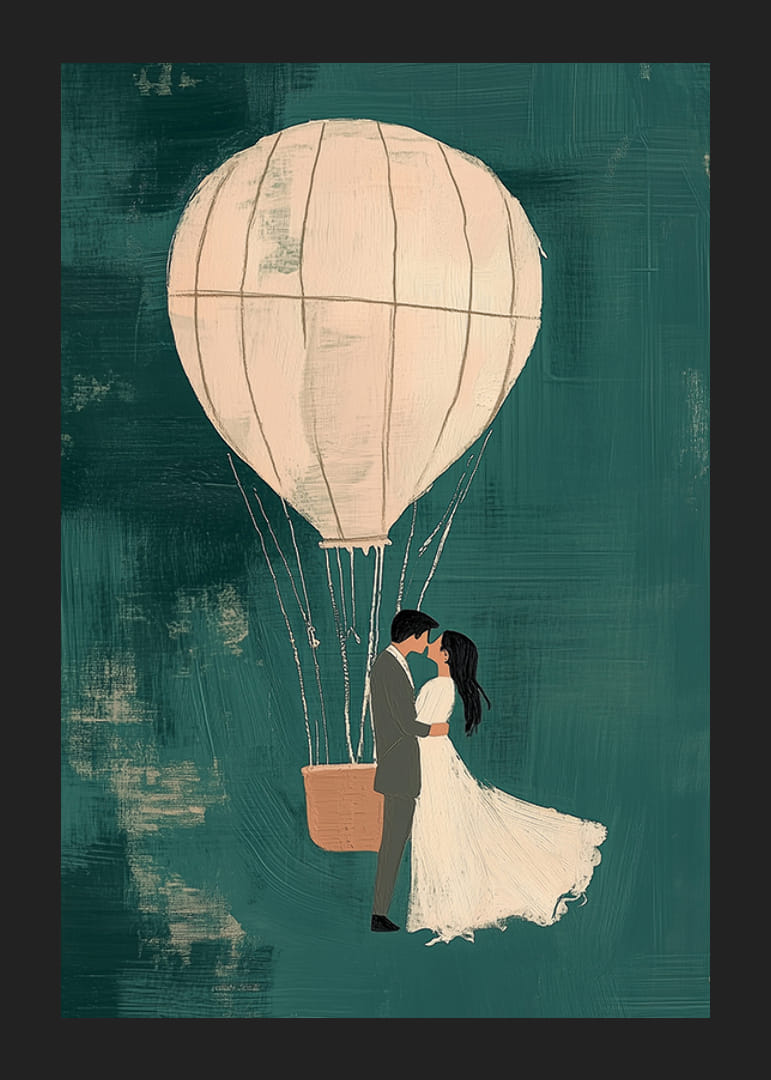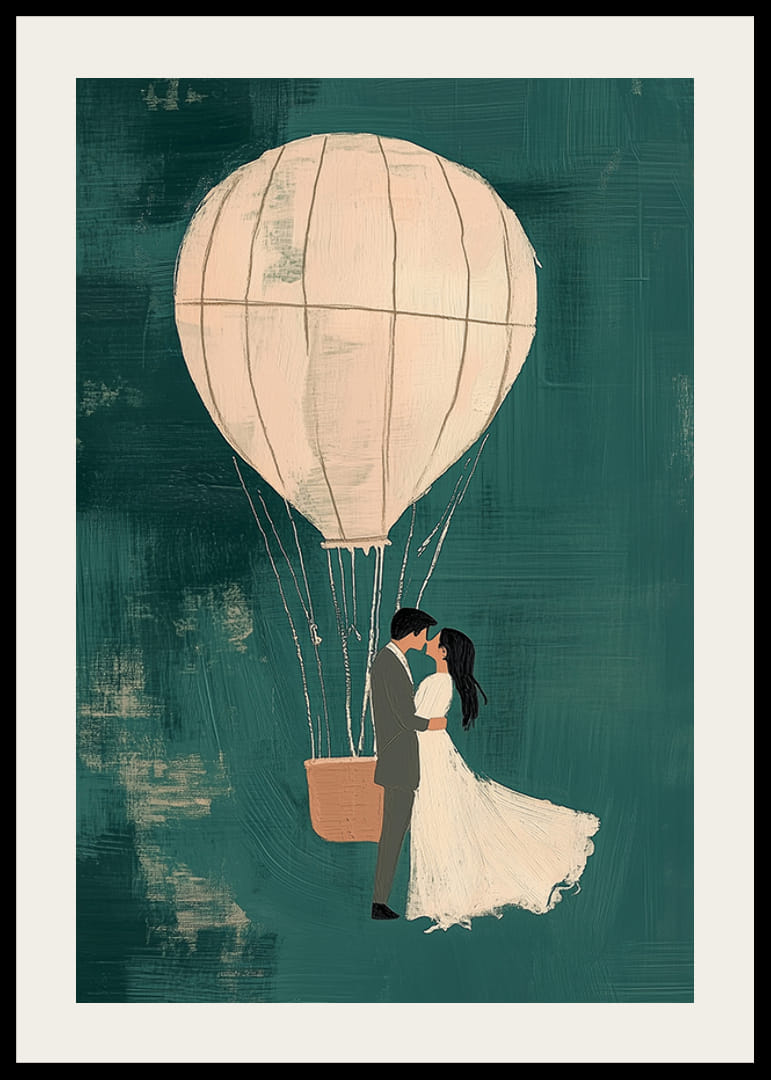 L'affiche capture un moment onirique où deux amoureux flottent dans une montgolfière sur un fond bleu-vert atmosphérique. Les nuances douces du ballon et du couple amoureux créent une sensation magique et romantique.