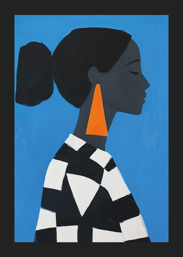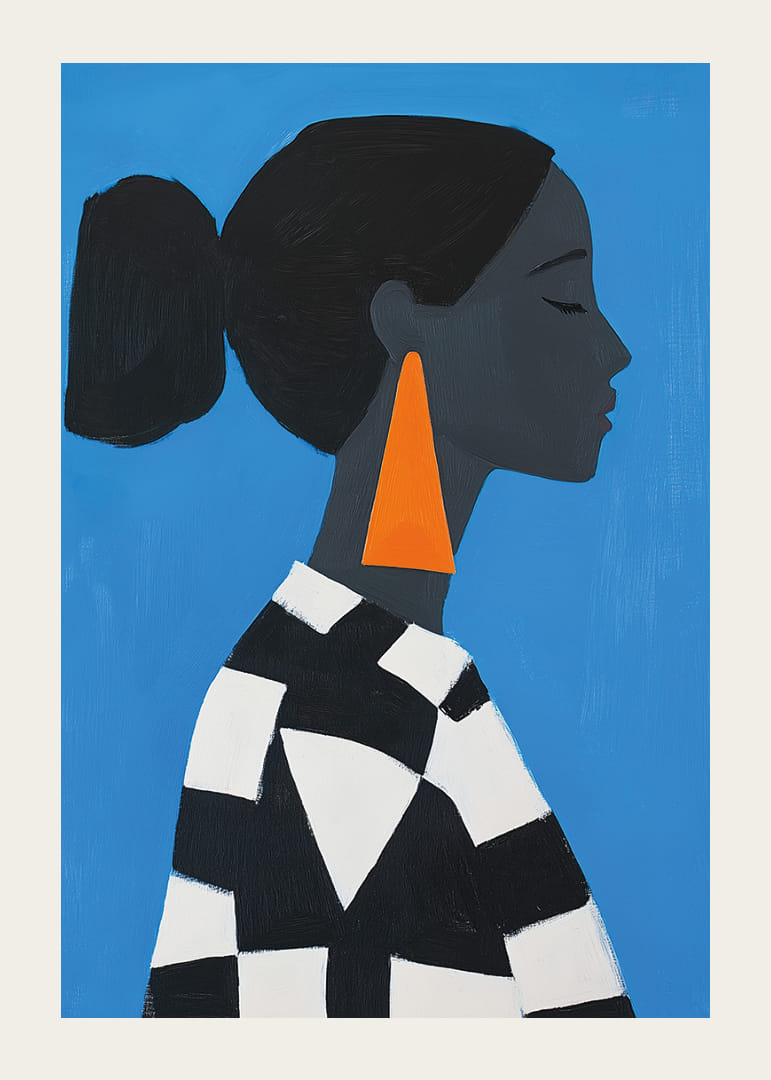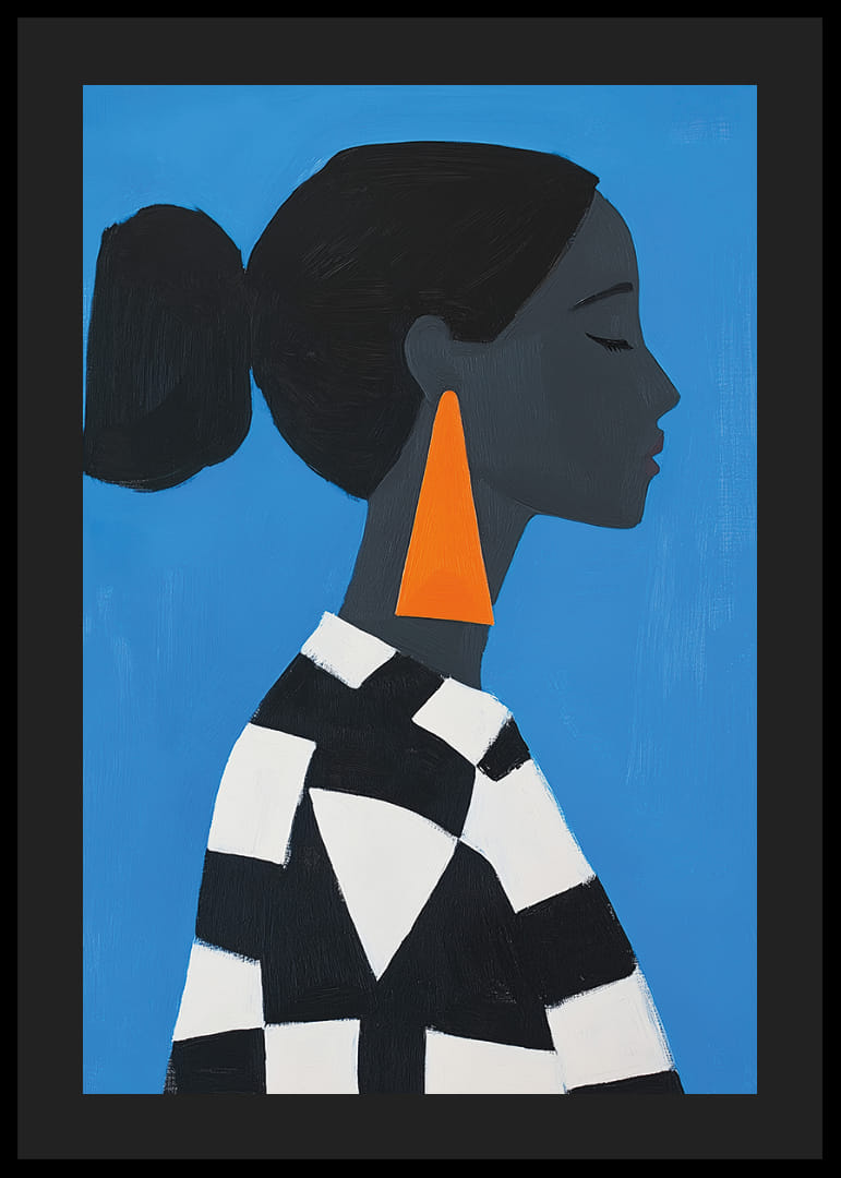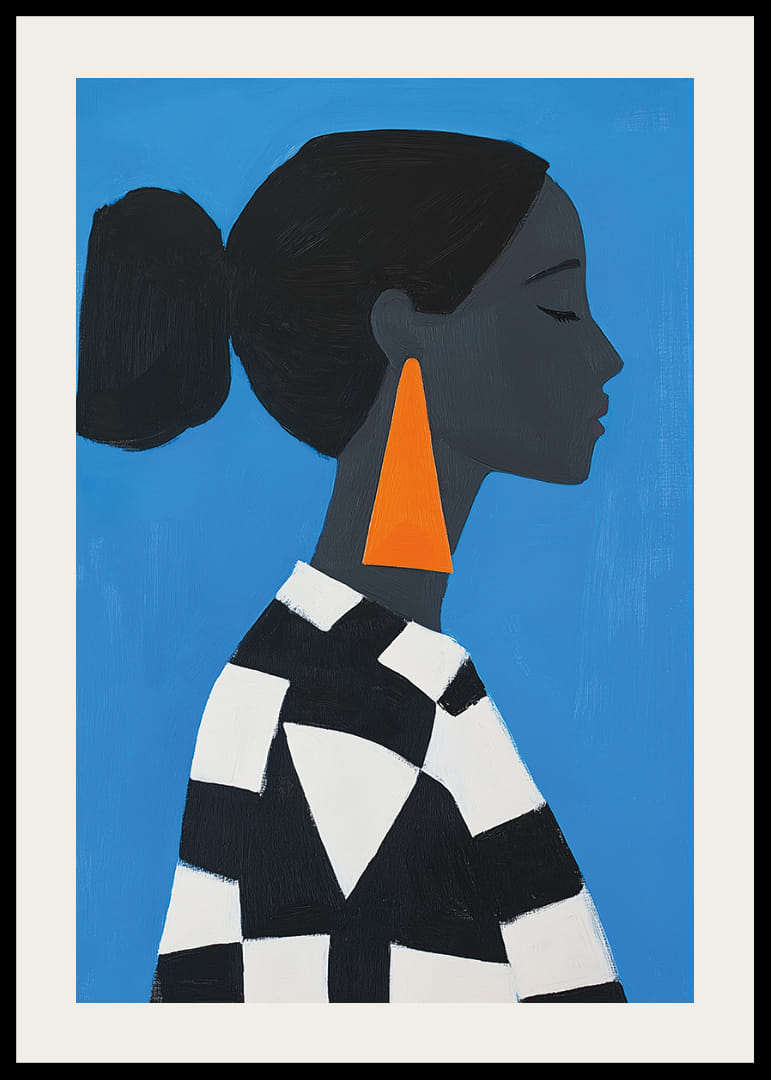 Cette affiche attire immédiatement le regard par son profil épuré et son fond bleu vif. Le visage contraste avec le motif géométrique noir et blanc, créant une harmonie de couleurs et de formes. Les boucles d'oreilles orange vif viennent perturber cette touche vibrante. L'affiche confère une touche moderne et élégante qui transformera n'importe quelle pièce en un environnement élégant et inspirant.