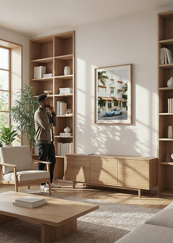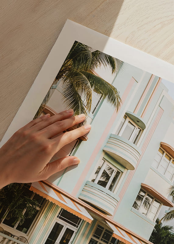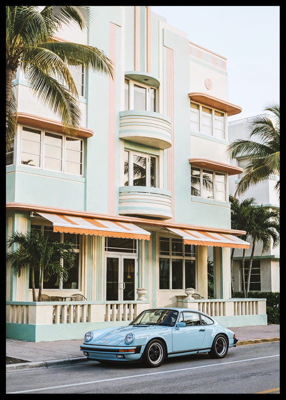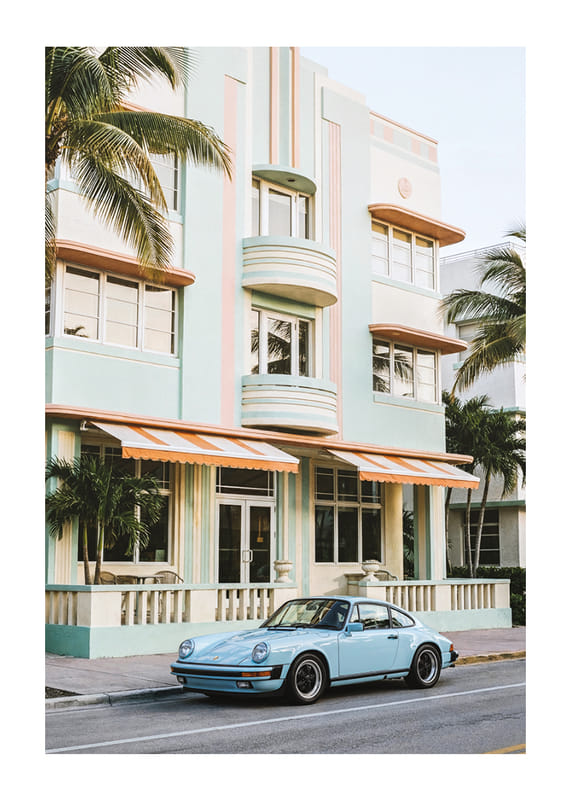 Cette affiche capture l'essence même de la nostalgie avec une Porsche 911 iconique garée devant un immeuble art déco aux teintes pastel à Miami Beach, encadrée par des palmiers se balançant au gré du vent. Il s'agit d'un modèle de la série G, produit entre 1974 et 1989. L'affiche apporte une touche rétro sophistiquée à votre pièce, transformant n'importe quel espace en un havre de paix élégant et inspirant des rêves de voyages intemporels.