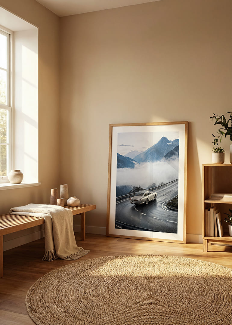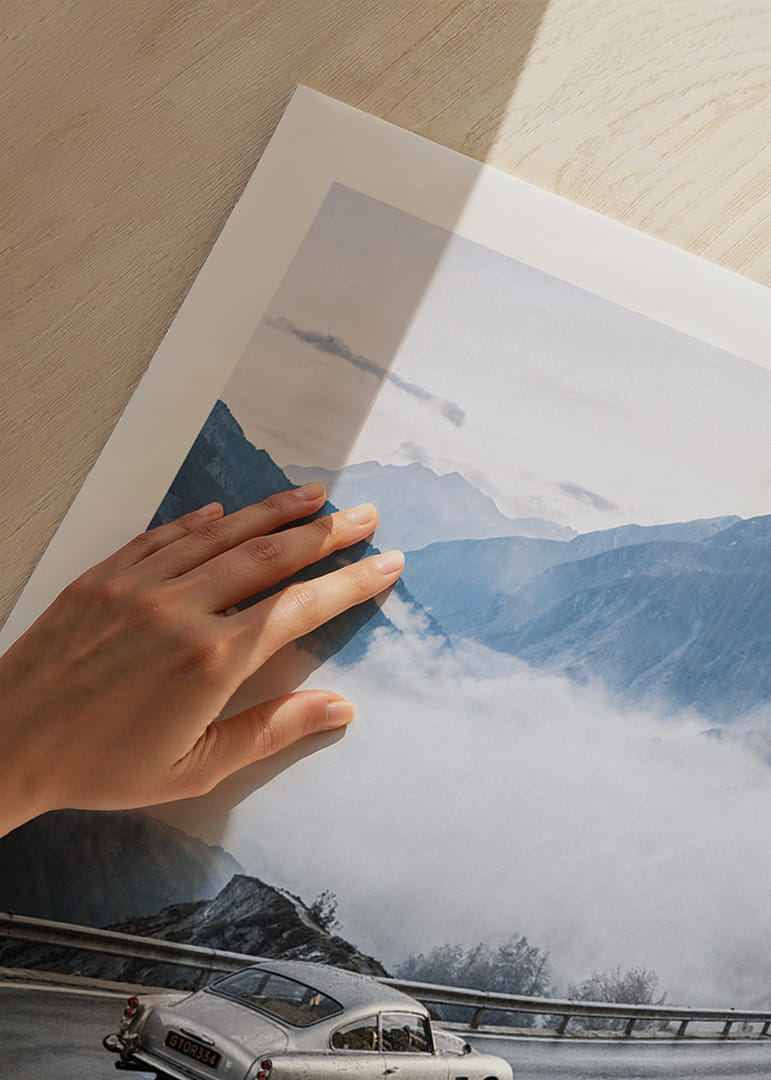 Une affiche irrésistible immortalise une Aston Martin DB5 filant sur une route de montagne sinueuse, enveloppée d'un brouillard mystérieux et dominée par de majestueux sommets. L'élégance intemporelle de la voiture, alliée à la beauté spectaculaire du paysage, crée une puissante impression de liberté, de luxe et d'aventure. Ce motif éveille des rêves de grands espaces et de découvertes. Une affiche qui transforme la pièce en un lieu où chaque regard invite au prochain voyage.