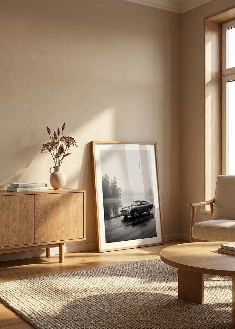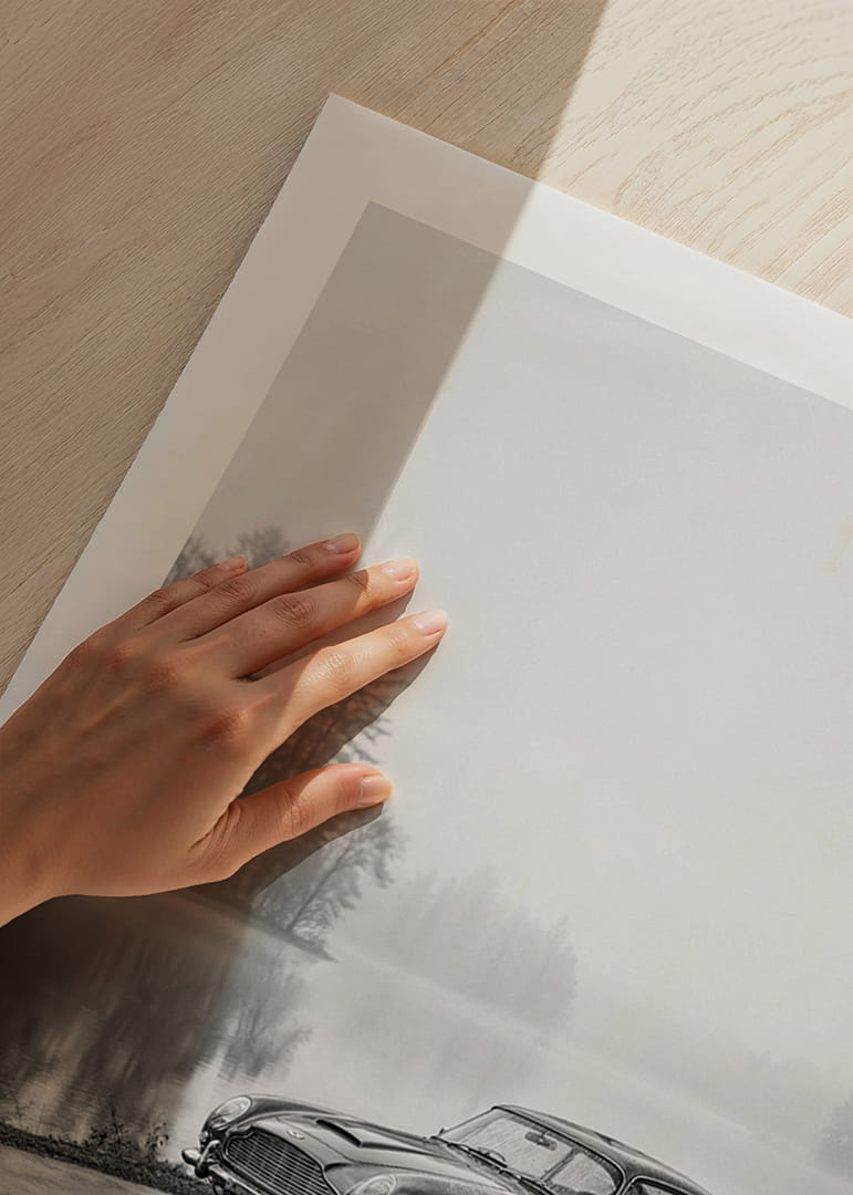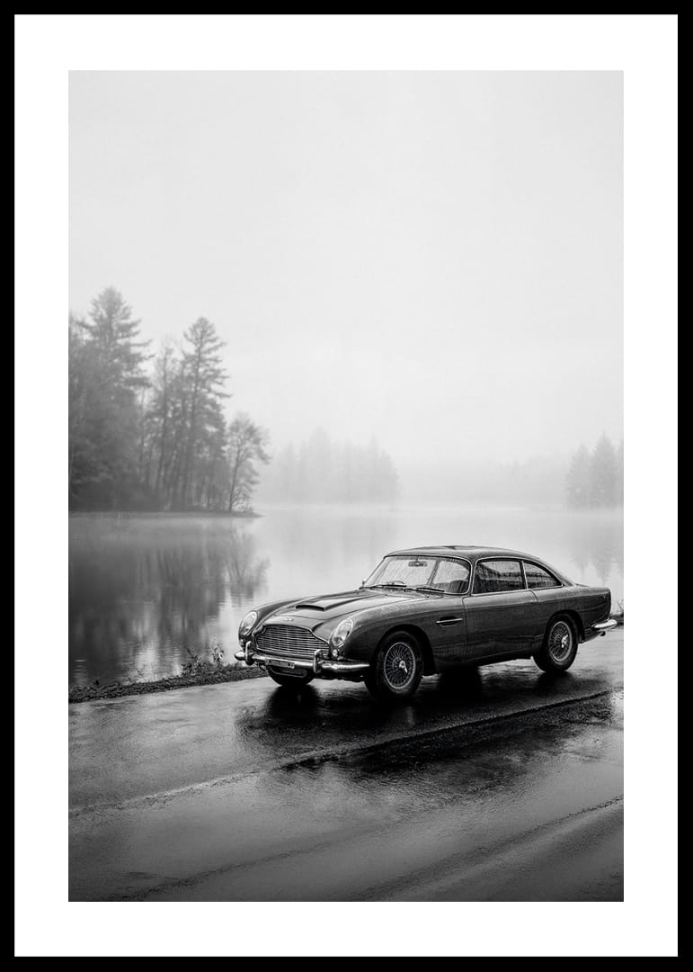 Cette affiche immortalise une Aston Martin DB5 se dressant fièrement sur une mer enveloppée de brume, au cœur d'un paysage paisible et onirique. Les douces nuances de gris soulignent l'élégance intemporelle de la voiture et créent une atmosphère de douce nostalgie. La brume qui flotte entre les arbres à l'arrière-plan confère à la scène une dimension mystérieuse et cinématographique. Une affiche qui apporte sophistication et sérénité à votre intérieur, tout en éveillant en vous transportant dans une époque révolue, celle du style classique.