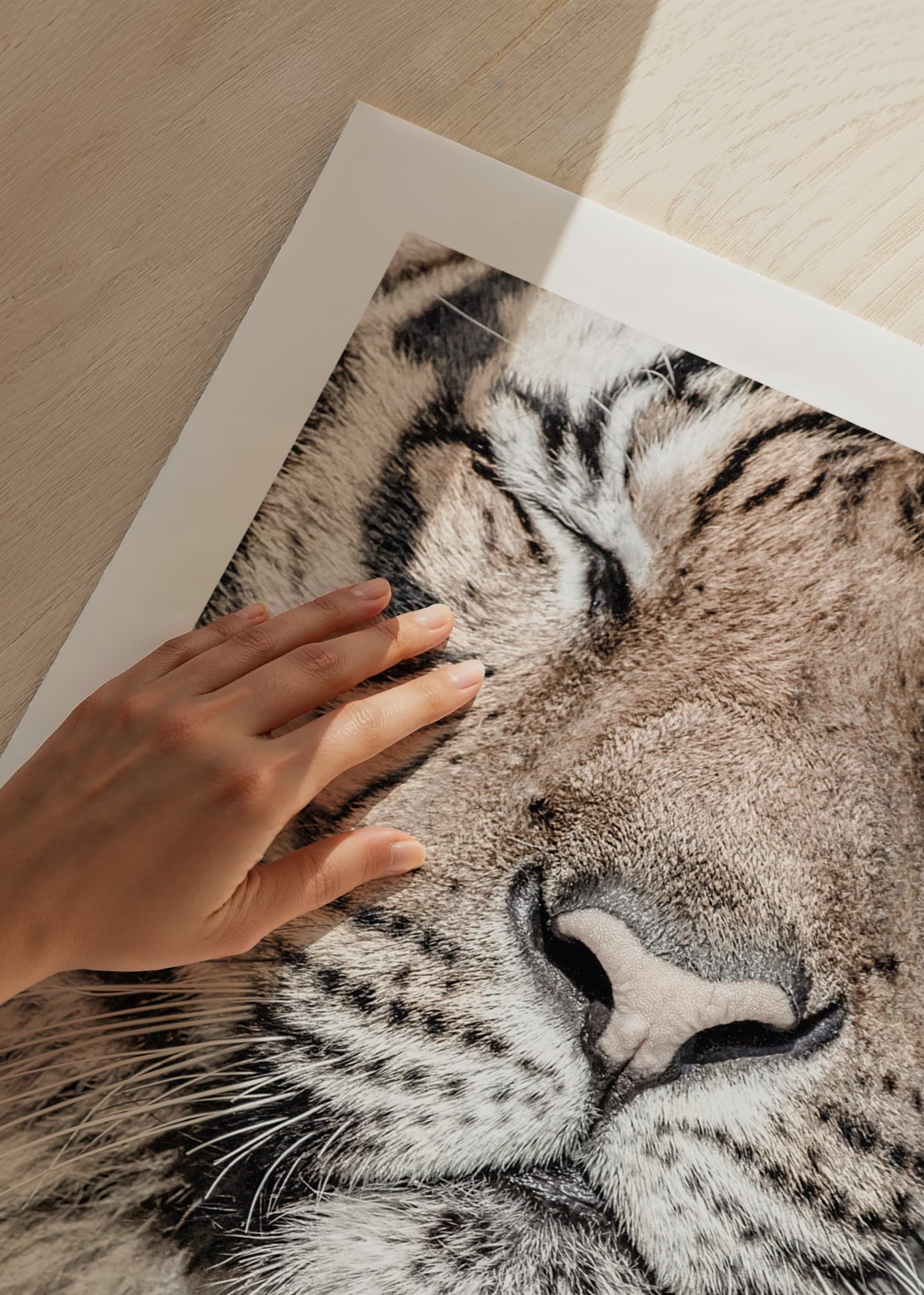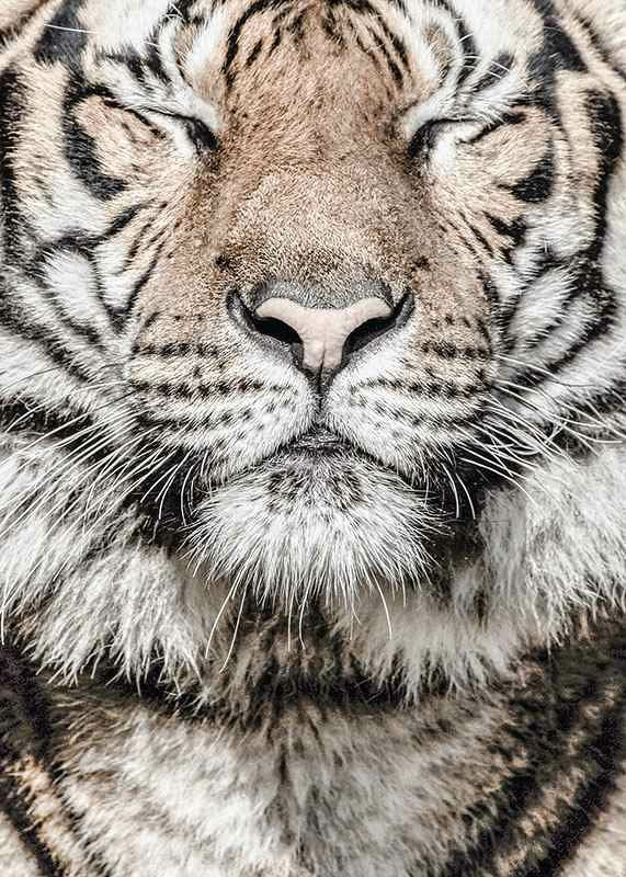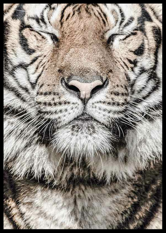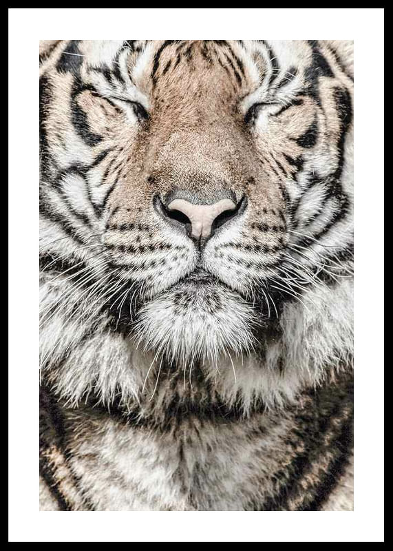 Gros plan sur le visage d'un tigre aux yeux clos, où le museau et les moustaches ressortent nettement. La fourrure présente des nuances de beige, de blanc et de noir, avec des rayures distinctes. La structure détaillée de la fourrure lui confère un aspect naturel. Avec ce motif, l'affiche contribue à une ambiance animalière et à une atmosphère apaisante, par exemple dans un salon ou un bureau.