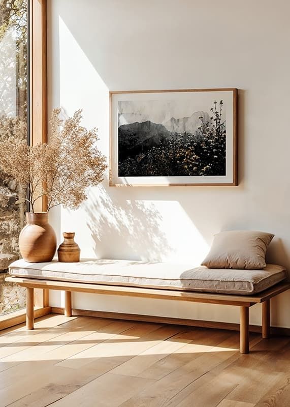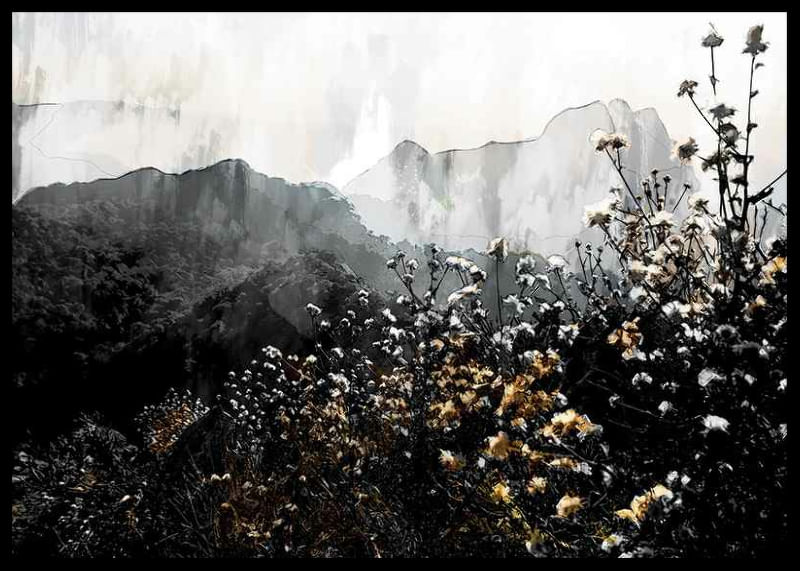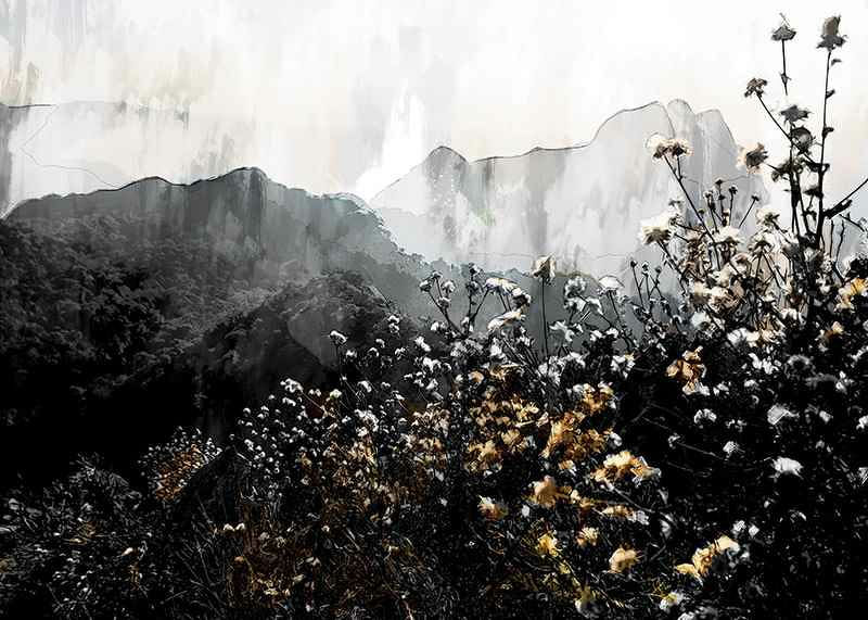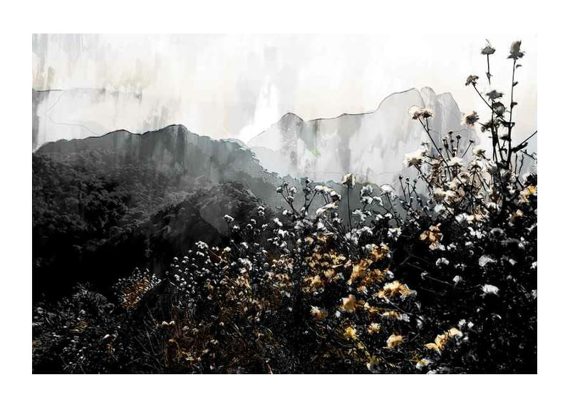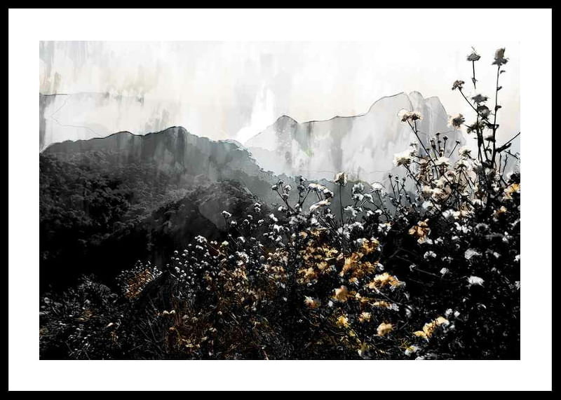Sur cette affiche, des fleurs aux tons jaunes et blancs se déploient devant des formations rocheuses sombres. L'arrière-plan, à l'aspect flou et peint, met en valeur les plantes sauvages au premier plan. Une belle association de formes spectaculaires et de couleurs douces, idéale pour un salon ou une entrée à l'ambiance naturelle.