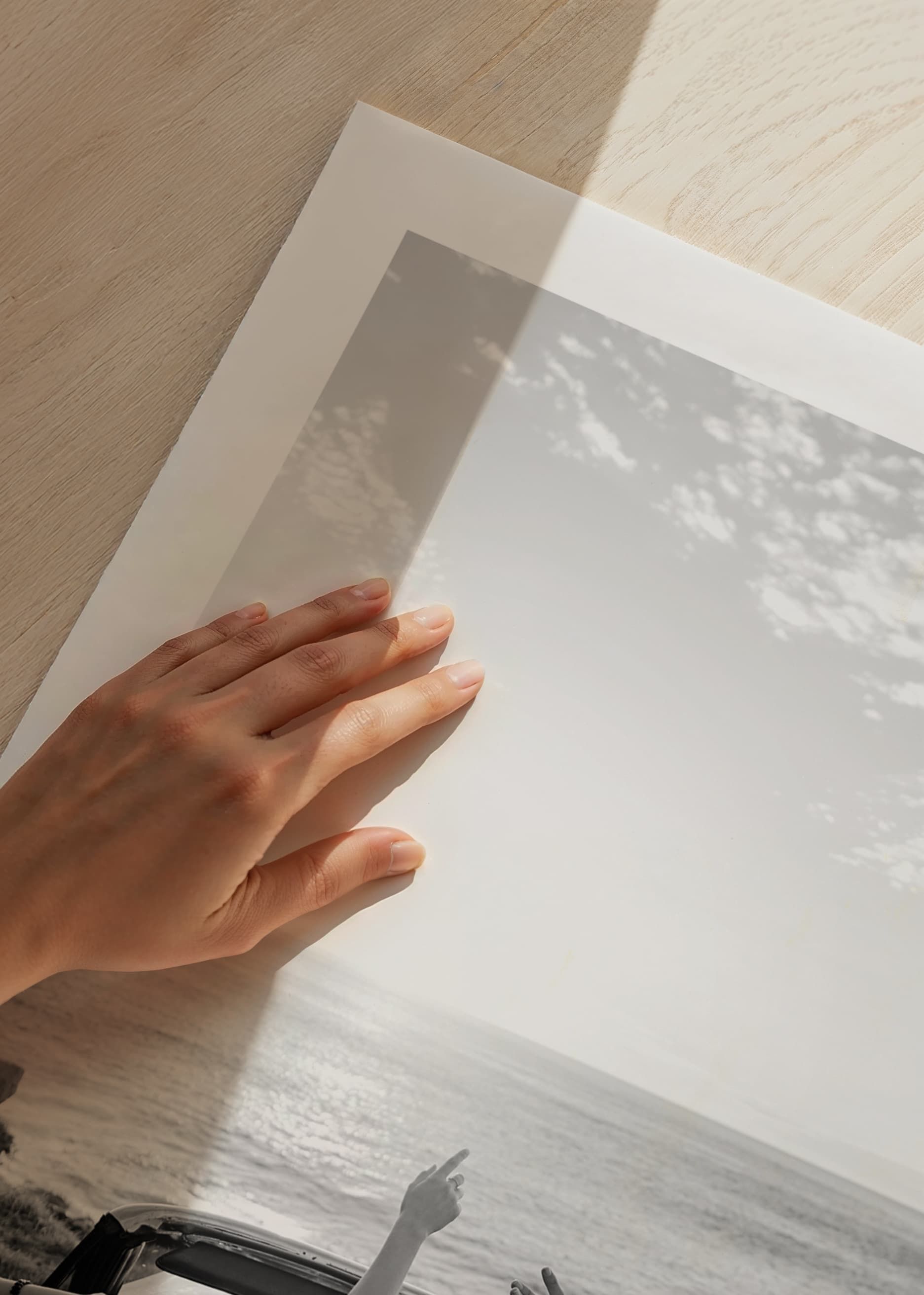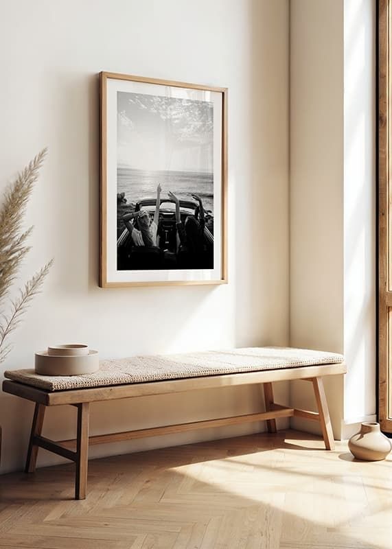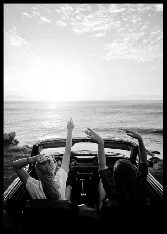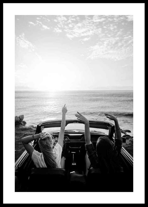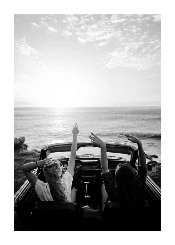 Deux jeunes femmes sont assises dans une décapotable garée sur la côte, contemplant le large tandis que le soleil se couche. Le motif se caractérise par des poses décontractées et des mouvements spontanés, capturés dans un noir et blanc classique. Cette affiche convient parfaitement aux espaces de convivialité où règnent liberté et souvenirs d'été.