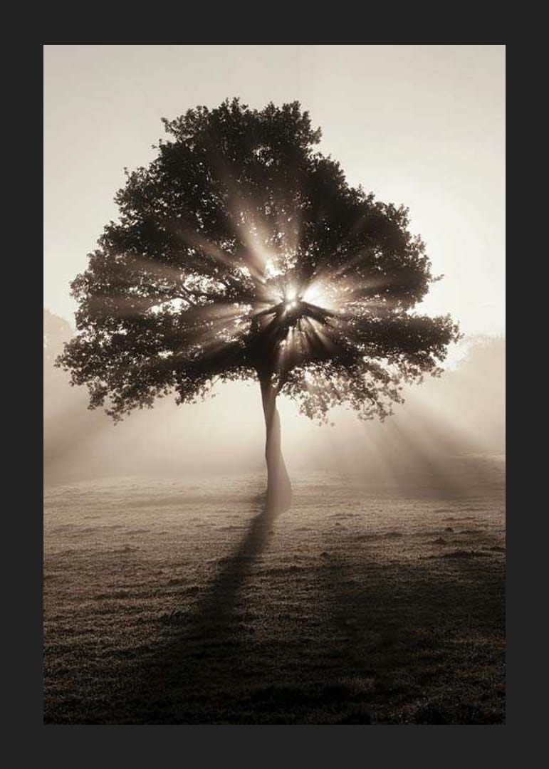 Un arbre caduc solitaire se dresse dans une prairie ouverte, baignée par la douce lumière matinale où les rayons du soleil filtrent à travers les branches et créent des ombres distinctes au sol. Des tons terreux et une atmosphère brumeuse créent une atmosphère paisible. Cette affiche apporte le calme de la nature et la force du lieu à tous les espaces, de la chambre au salon.