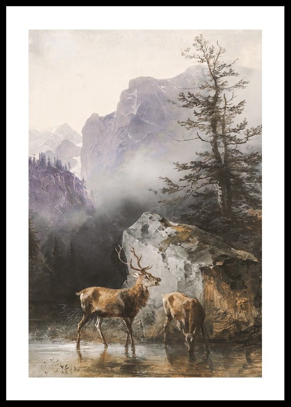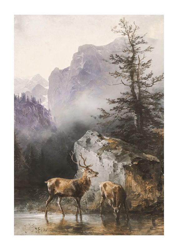 Hirsch Und Tier An Der Tränke By Friedrich Gauermann