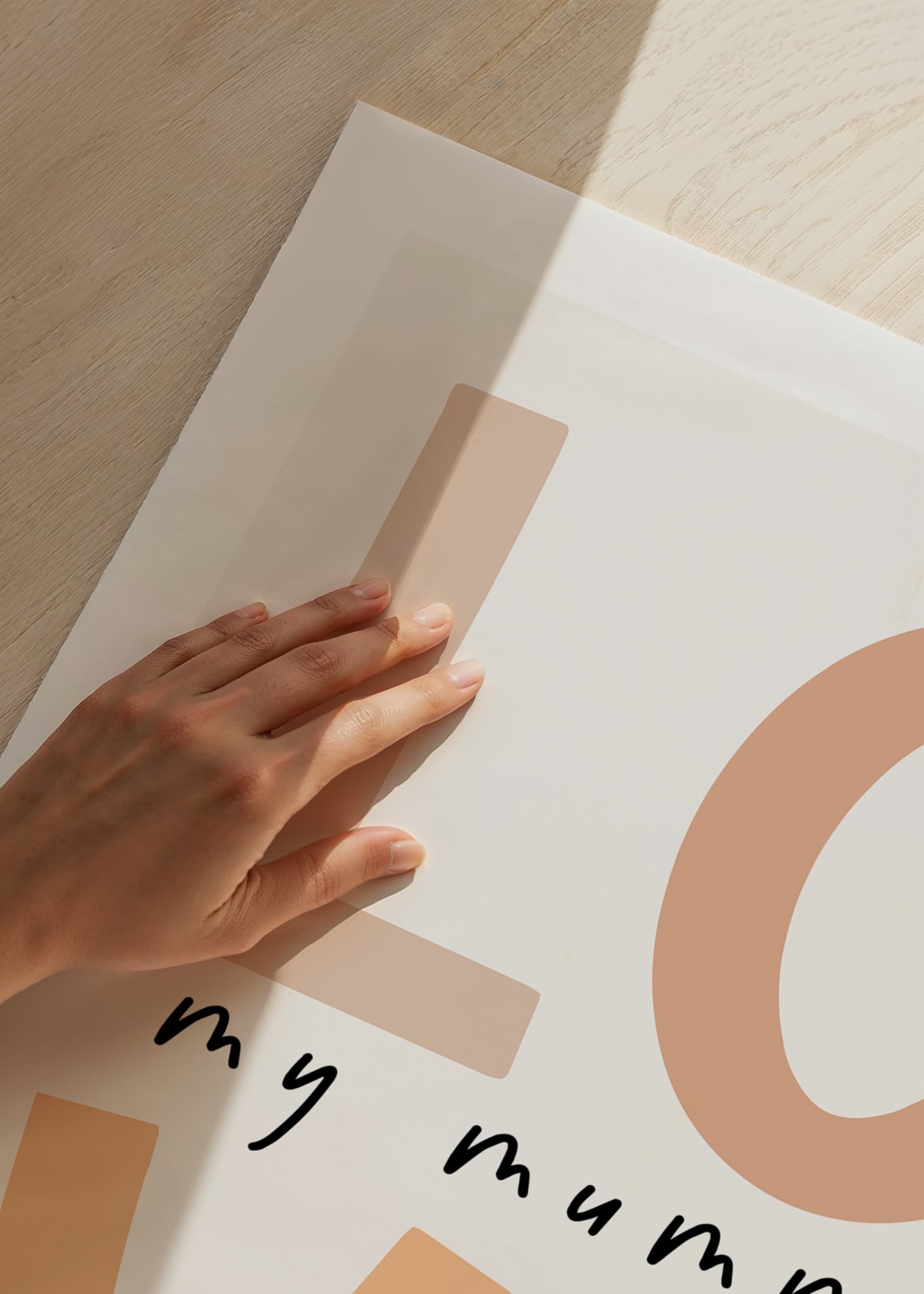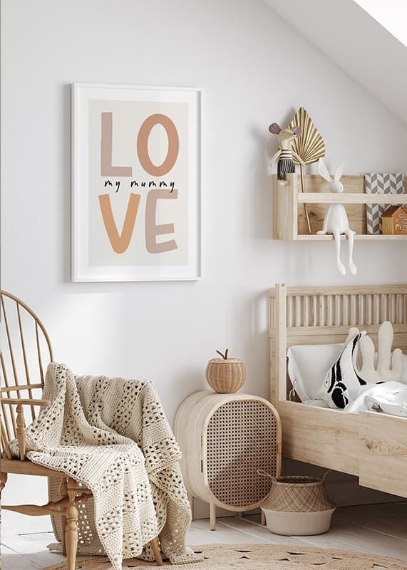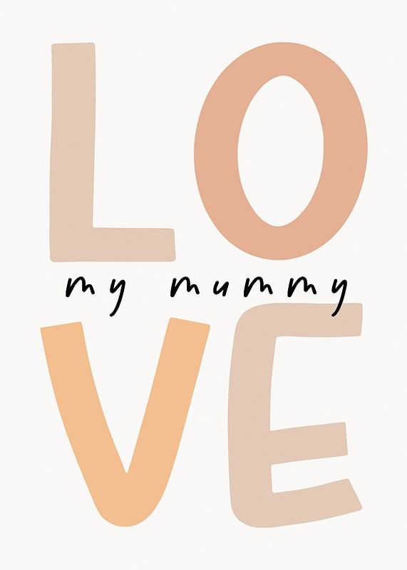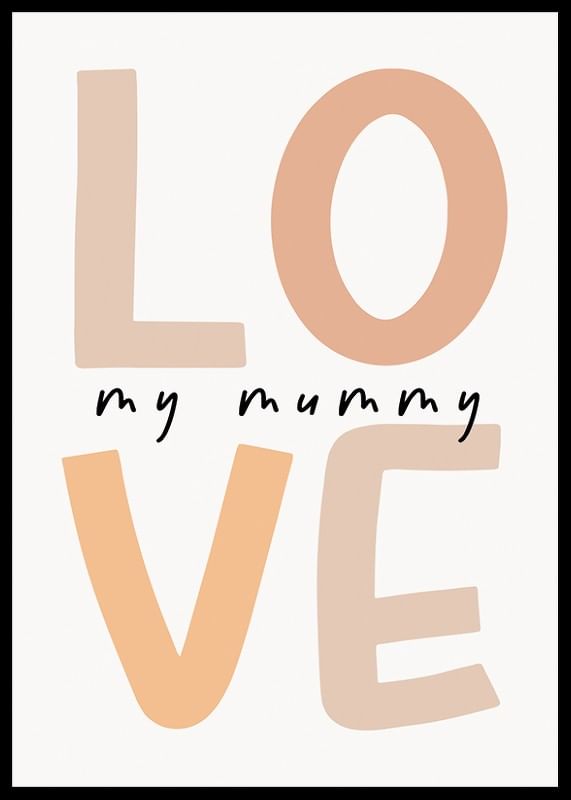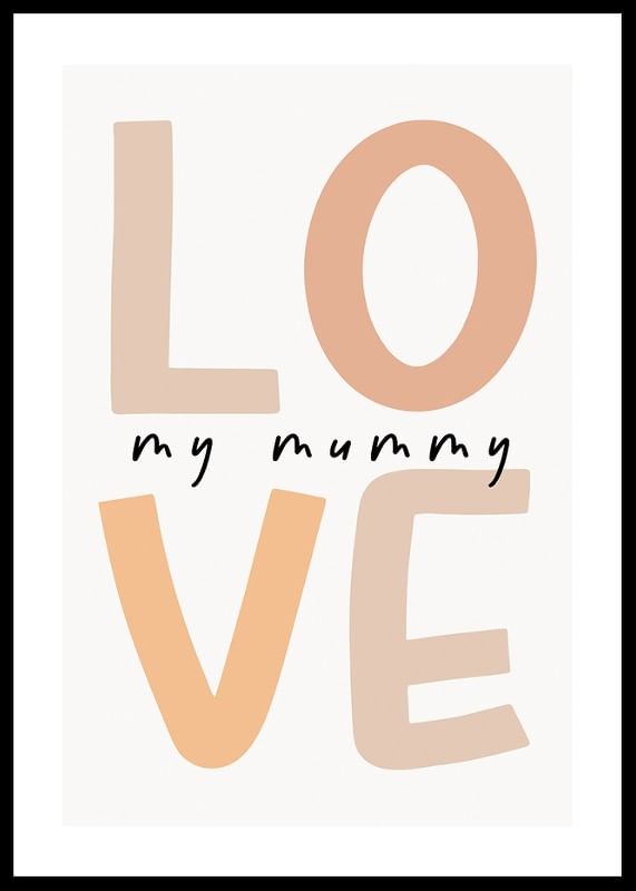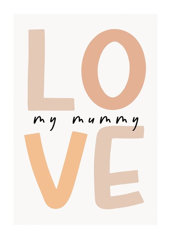 De grandes lettres aux tons doux et discrets de beige et d'abricot forment le mot LOVE, avec l'inscription « my mummy » manuscrite en noir au centre. Son design minimaliste et son fond clair permettent à cette affiche de trouver facilement sa place dans une chambre d'enfant ou une salle de jeux où une atmosphère chaleureuse et affectueuse est recherchée.