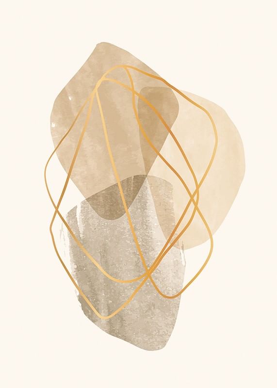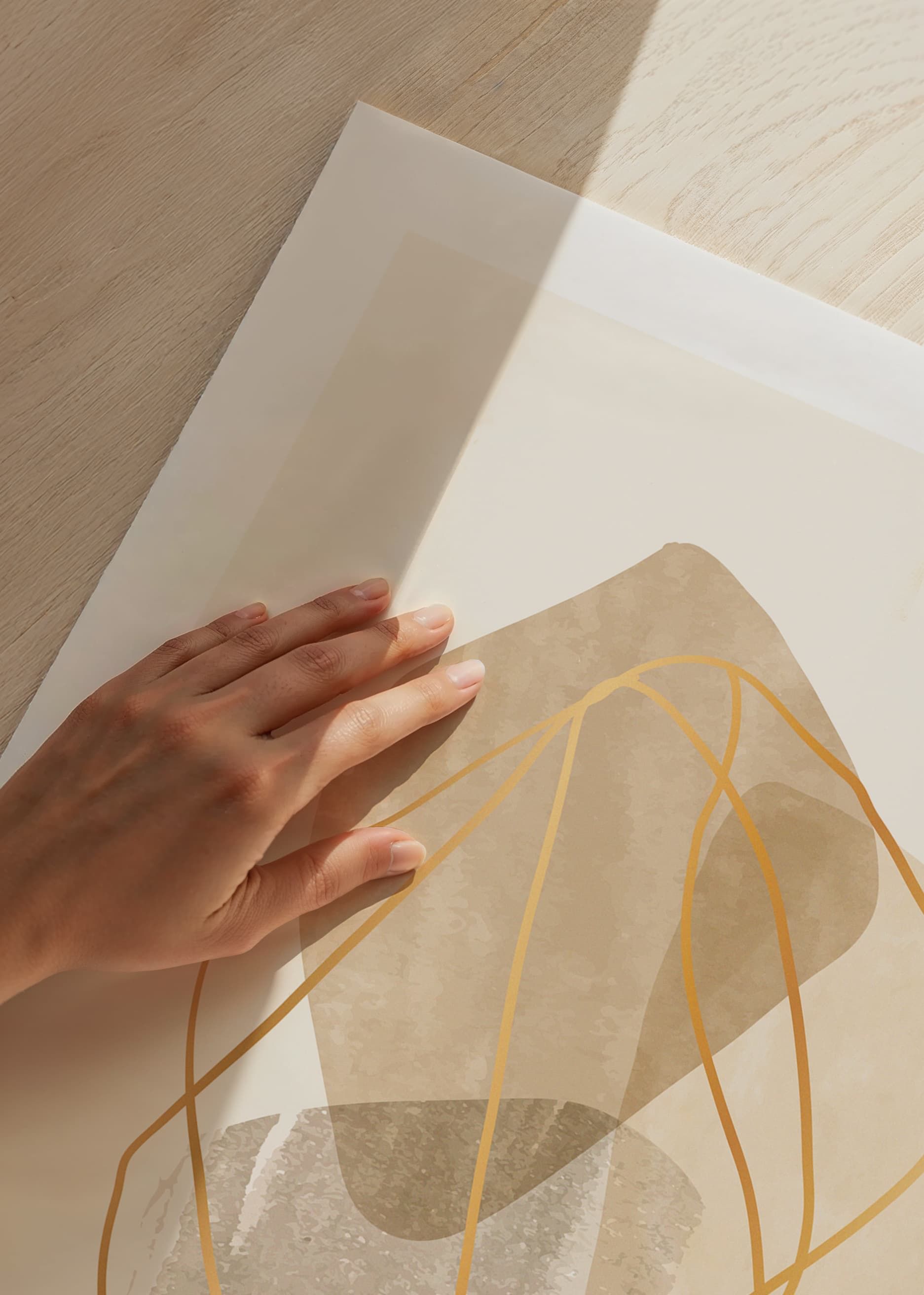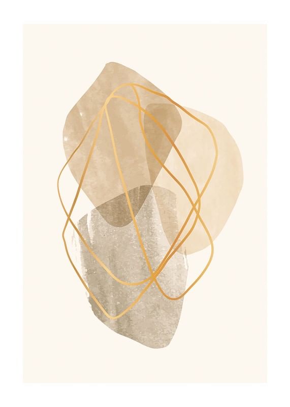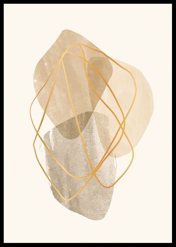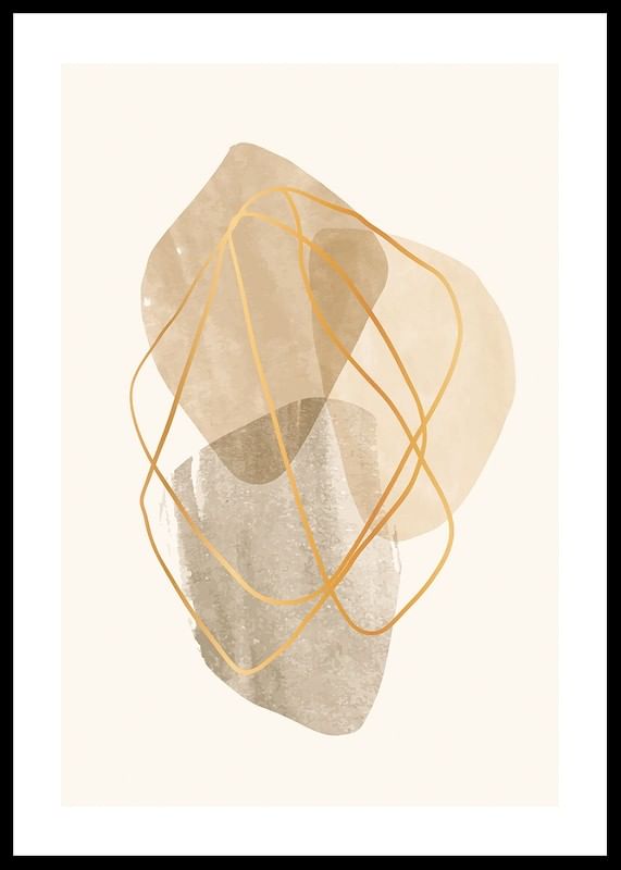 Des formes douces et transparentes aux tons marron et beige se superposent, tandis que de fines lignes courbes jaunes créent un contraste graphique sur le fond clair. L'association de couleurs terreuses et de formes minimalistes confère à l'affiche une touche moderne qui s'harmonise parfaitement avec un salon ou une chambre.