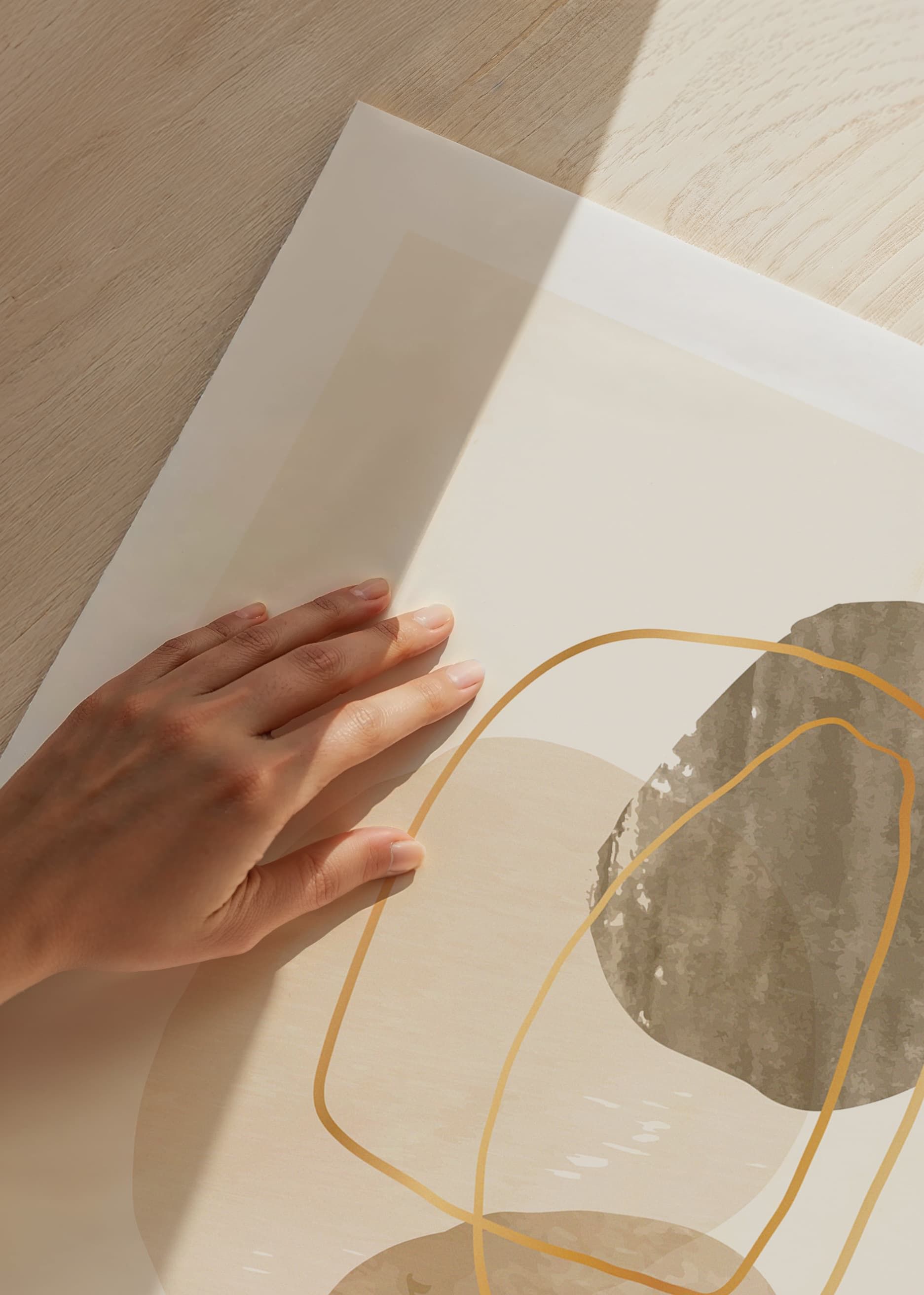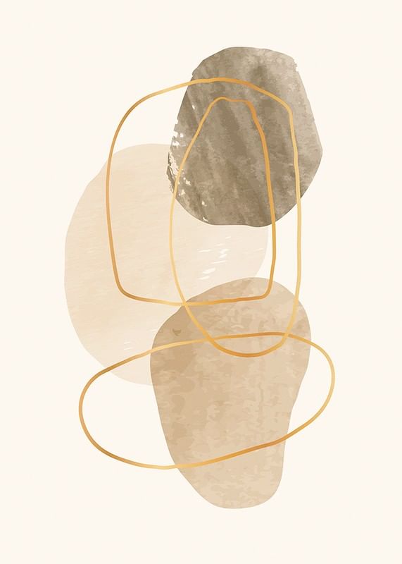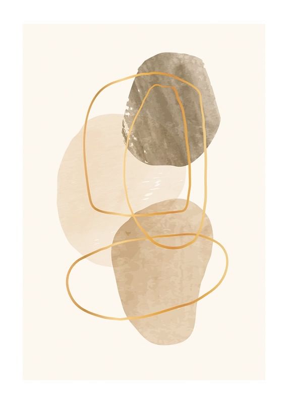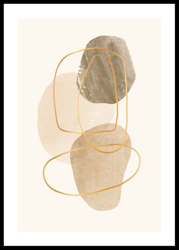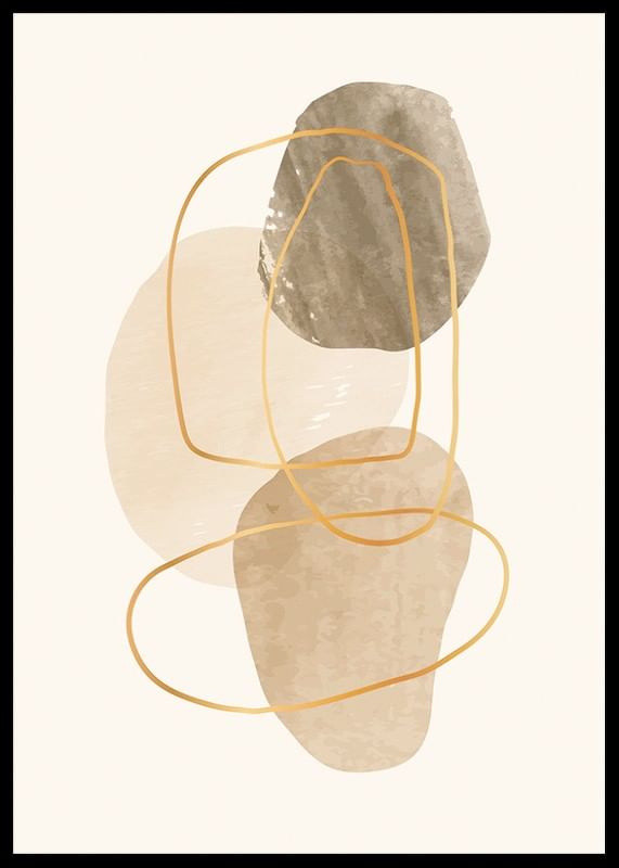 Des formes organiques aux nuances de beige et de marron se superposent sur un fond sable clair. De fines lignes irrégulières d'un jaune ocre encadrent et parcourent les zones colorées, créant une impression aérienne et contemporaine. Cette affiche sublimera facilement un intérieur moderne et conviendra à de nombreuses pièces.