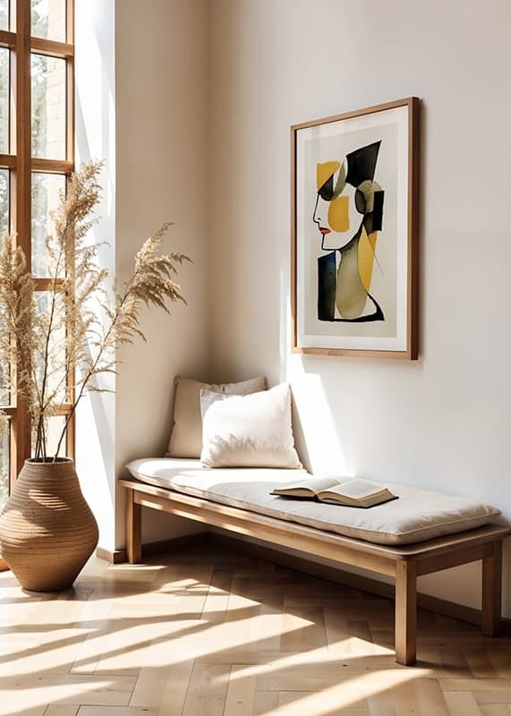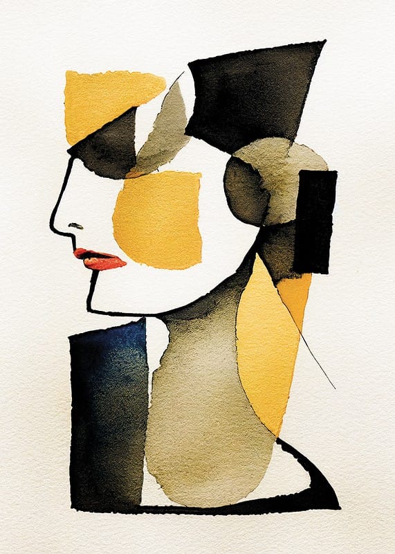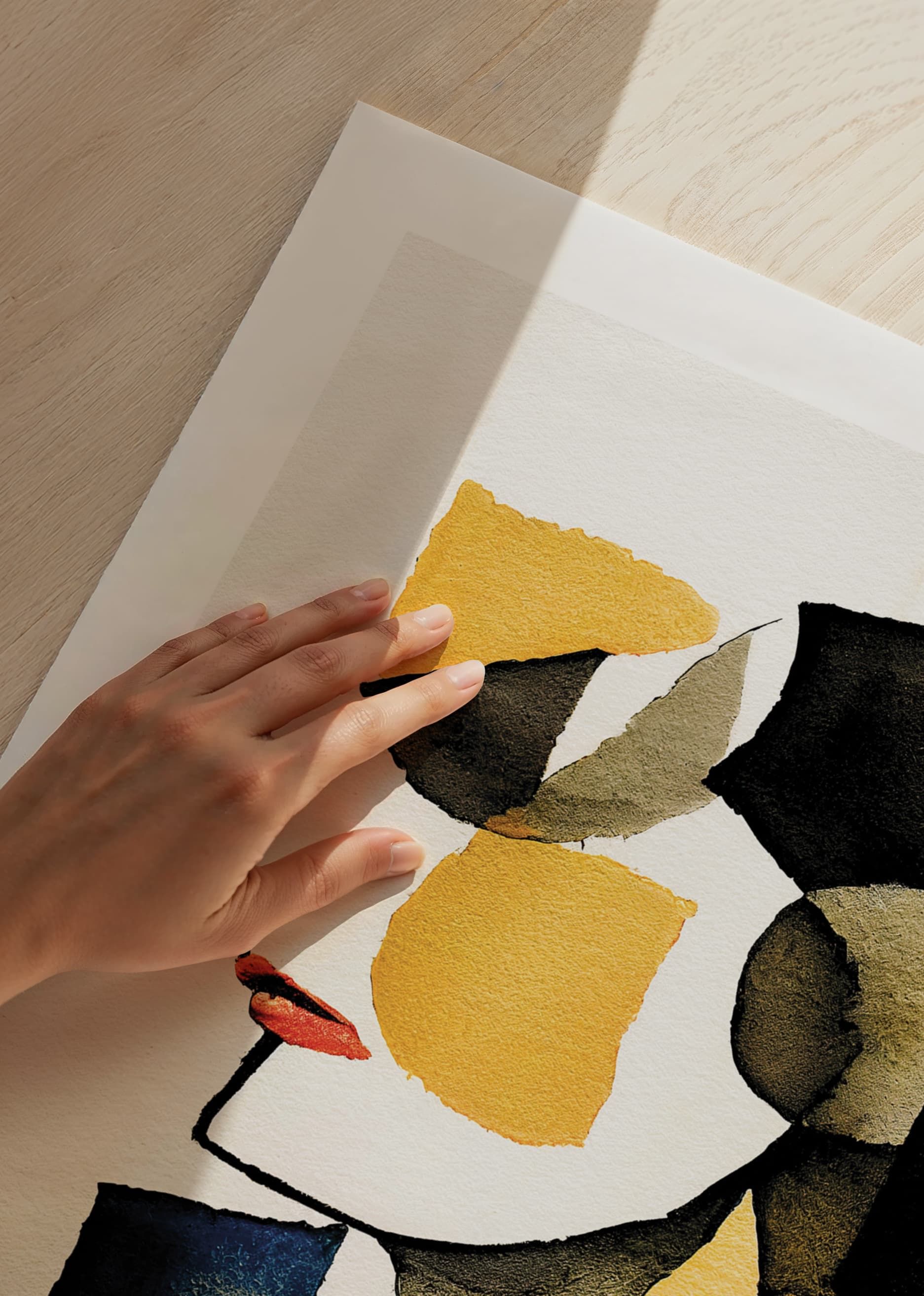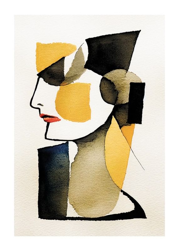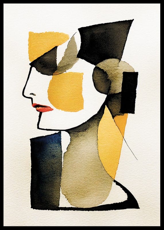 Le motif représente un portrait de profil abstrait où des formes géométriques douces en noir, jaune et beige dessinent un visage aux lèvres rouges. L'expression est stylisée et la composition joue avec les contrastes et les aplats de couleurs. Cette affiche, d'une esthétique moderne, s'intègre aussi bien dans un salon que dans un bureau.