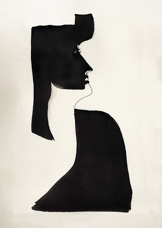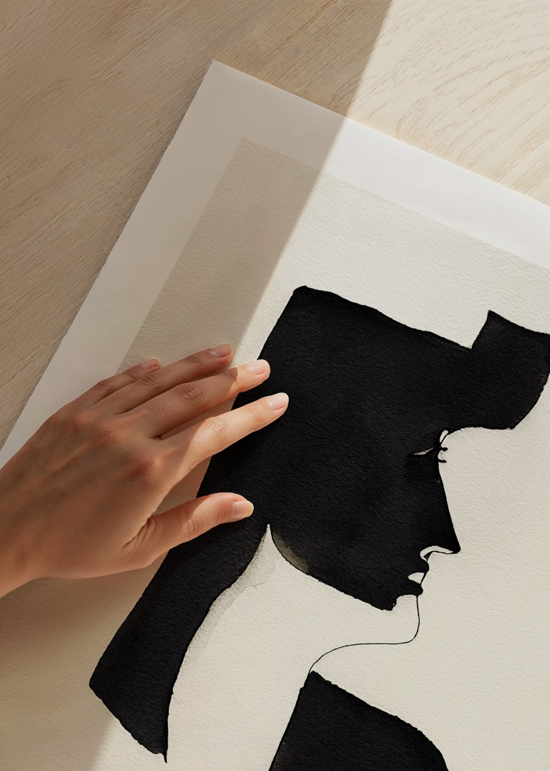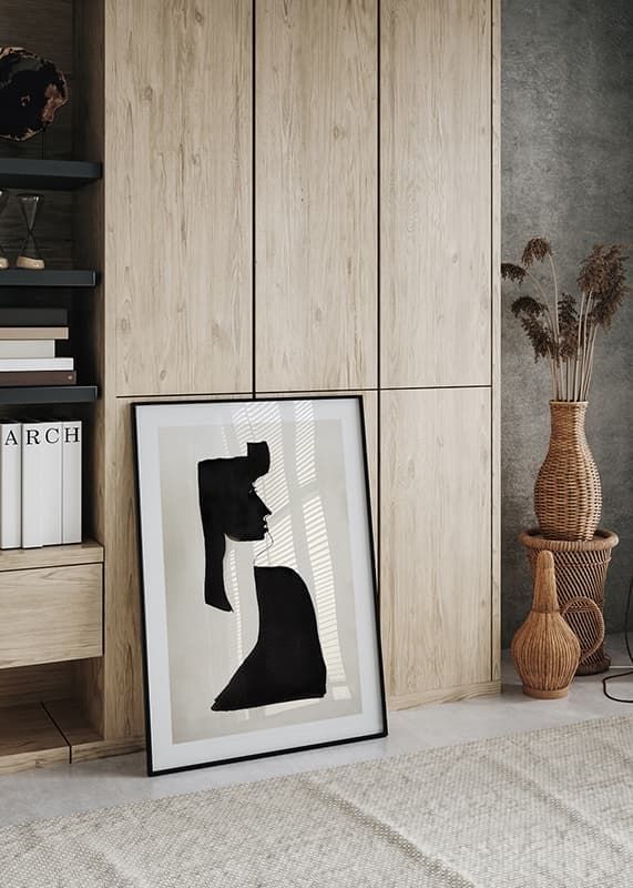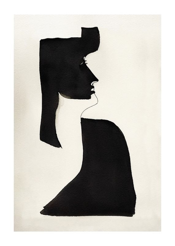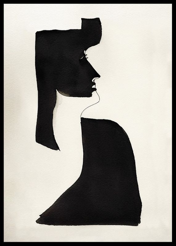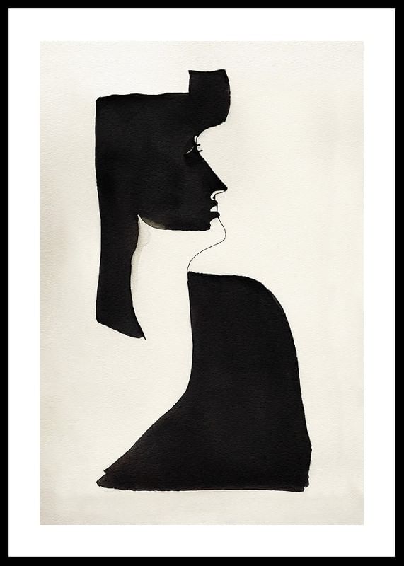 Des formes sombres créent une silhouette stylisée de profil noir sur un fond sable clair légèrement texturé. Un trait fin souligne le contour du visage, conférant au motif une touche moderne et graphique. Cette affiche est parfaite pour les pièces où vous souhaitez apporter une touche artistique et sobre.