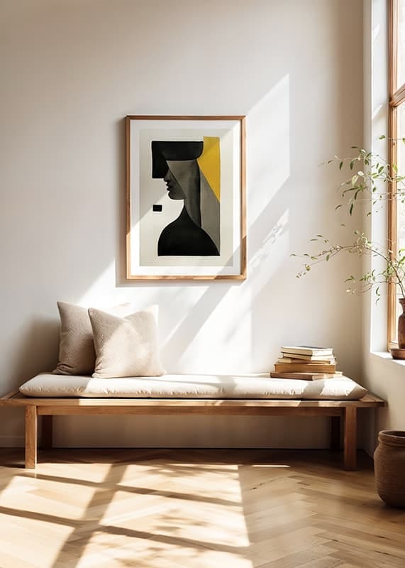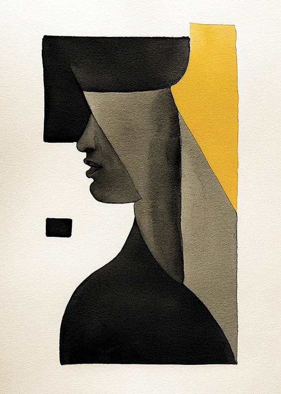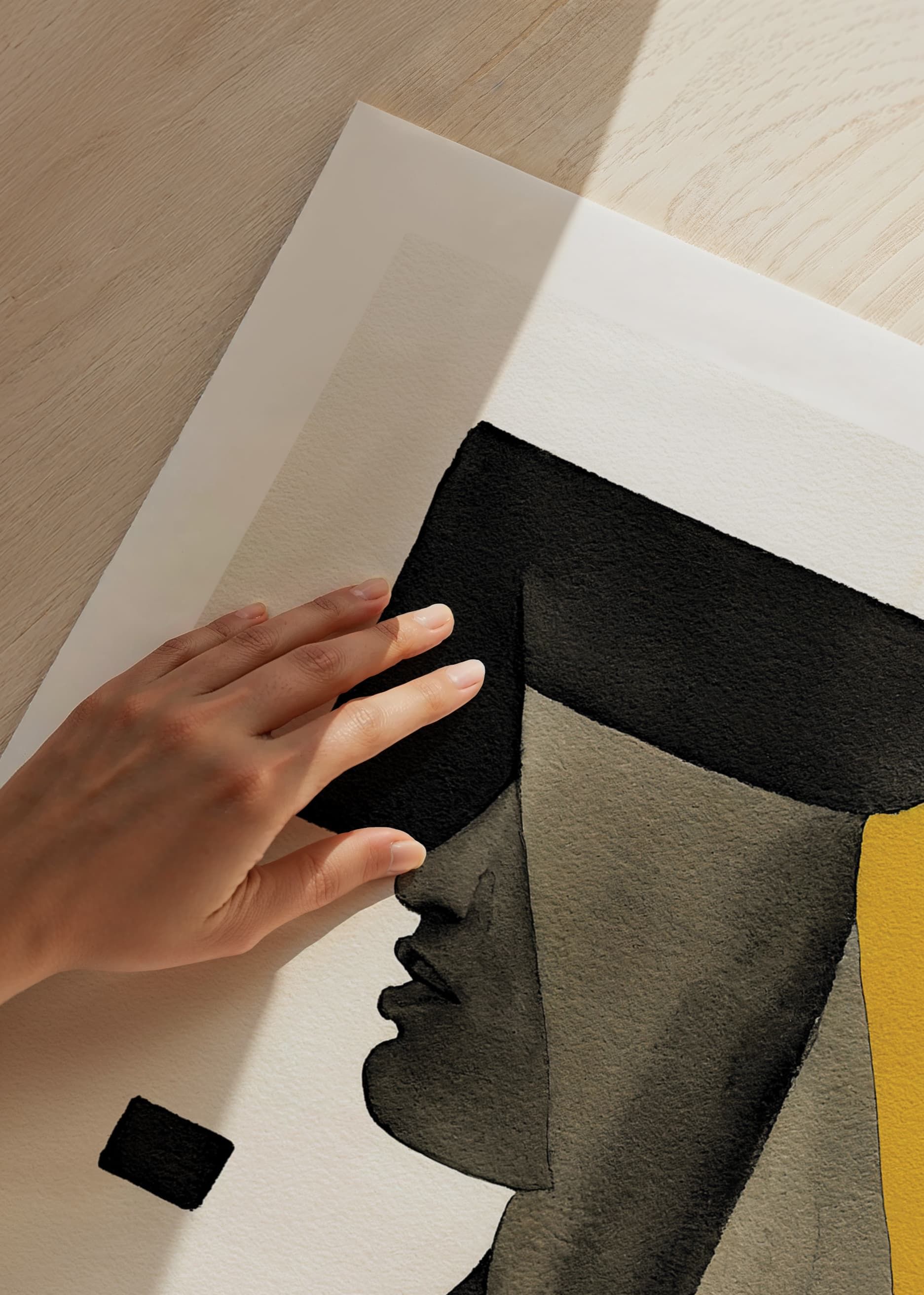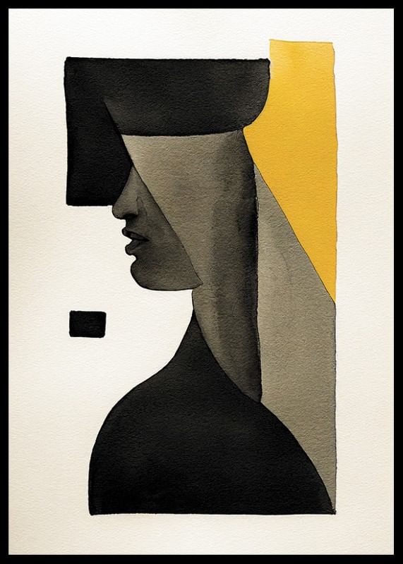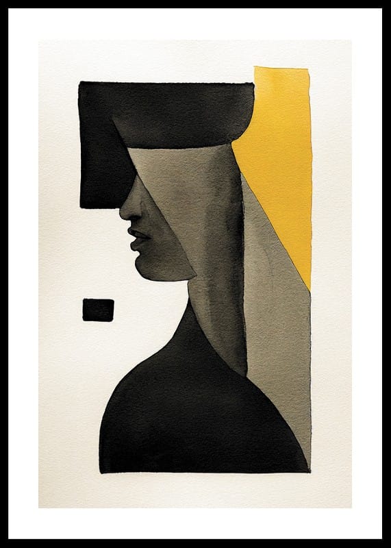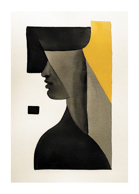 Le motif représente un profil abstrait de visage, composé de formes géométriques noires et grises, avec une partie jaune surlignée à droite. Le fond sable clair lui confère une impression de pureté et de modernité. Cette affiche convient parfaitement aux salons, aux bureaux ou aux environnements modernes où l'expression graphique est recherchée.