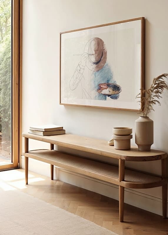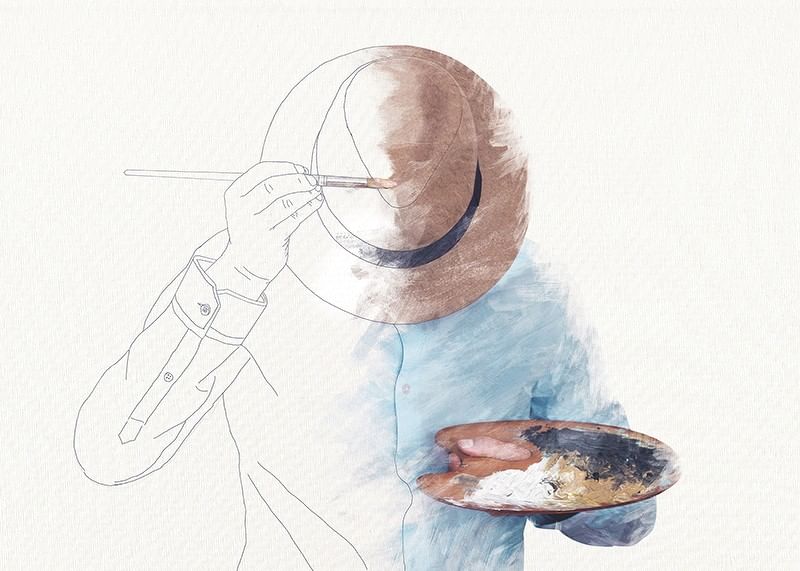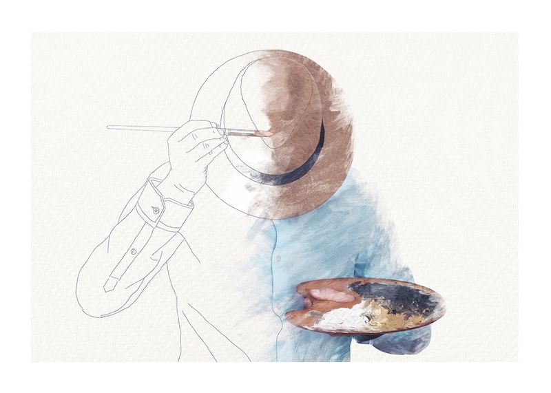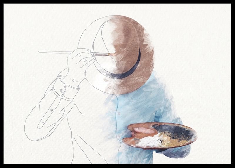 Un homme est représenté en partie au trait et en partie à l'aquarelle. Il tient une palette et peint son visage et son chapeau au pinceau, créant une atmosphère surréaliste. Cette affiche allie liberté artistique et introspection et est idéale pour les espaces créatifs ou de travail.
