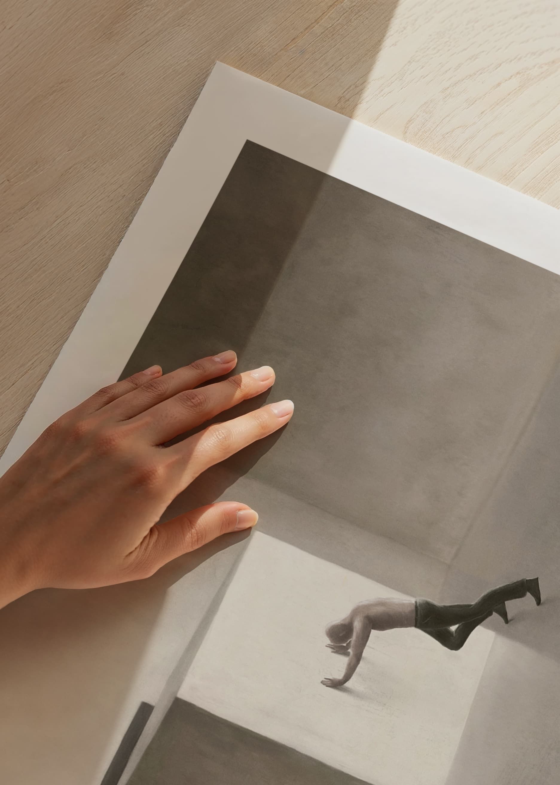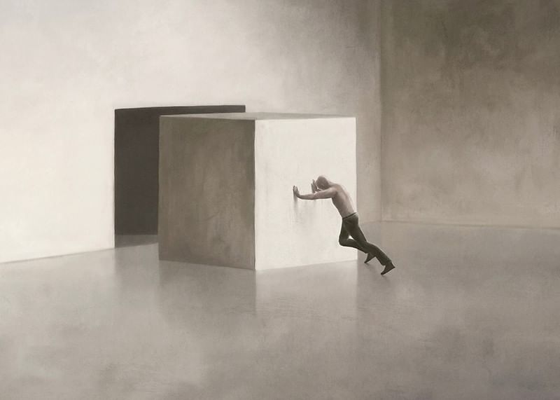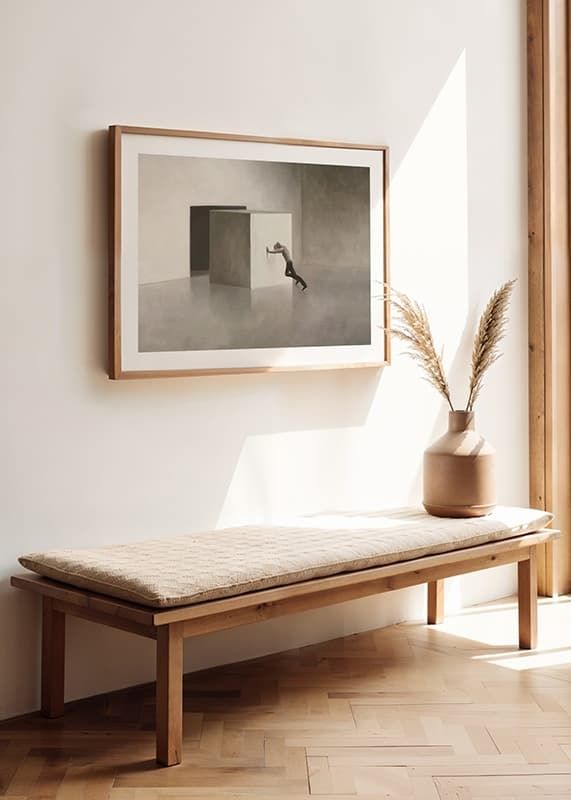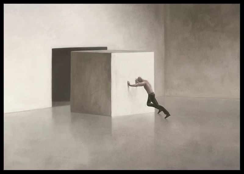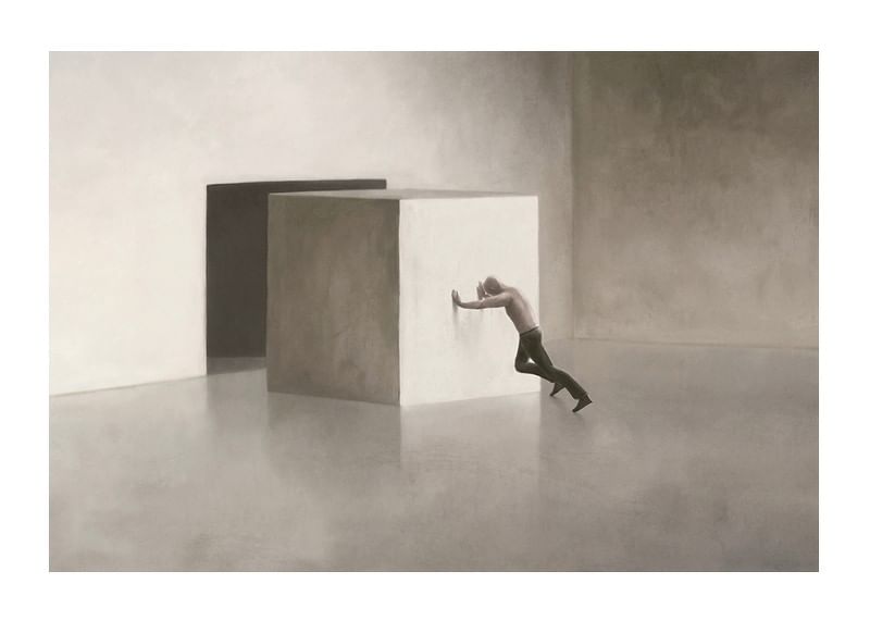Un homme seul tente de déplacer un cube massif et lumineux à travers une pièce gris-beige presque vide. Derrière le cube, une ouverture sombre dans le mur permet d'insérer la forme. Le motif épuré confère à l'affiche une allure moderne et conceptuelle, s'intégrant parfaitement aux environnements où la réflexion et la simplicité sont de mise.