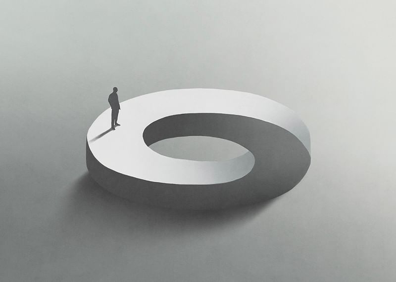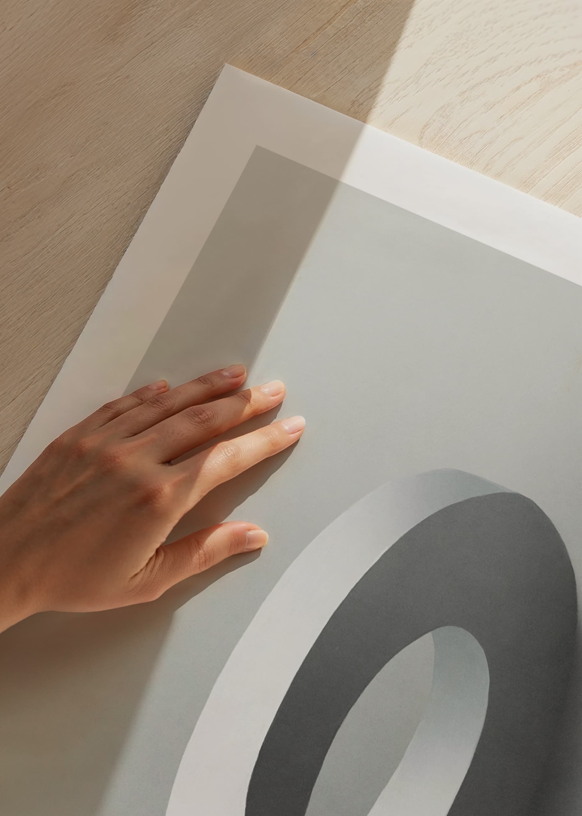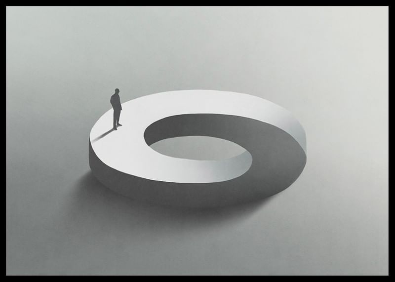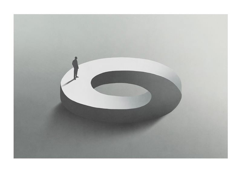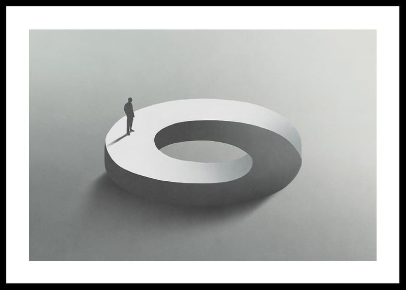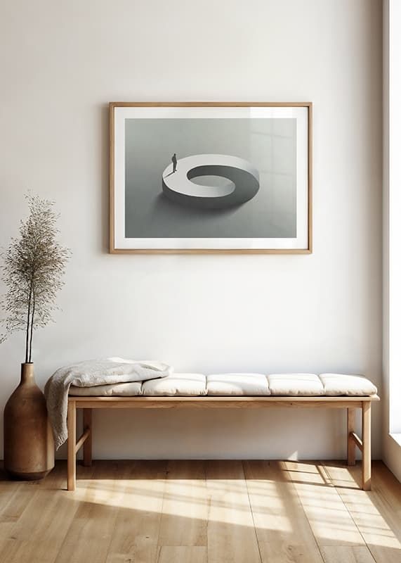 Une silhouette en costume sombre se dresse seule sur une grande structure circulaire blanche, créant l'illusion d'un chemin sans fin sur un fond gris clair. Le jeu d'ombres et le minimalisme confèrent au motif une expression sereine et propice à la réflexion. Idéale comme affiche dans les pièces modernes où les motifs conceptuels subliment le reste de la décoration.