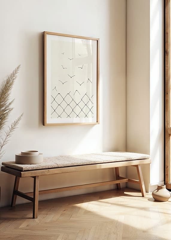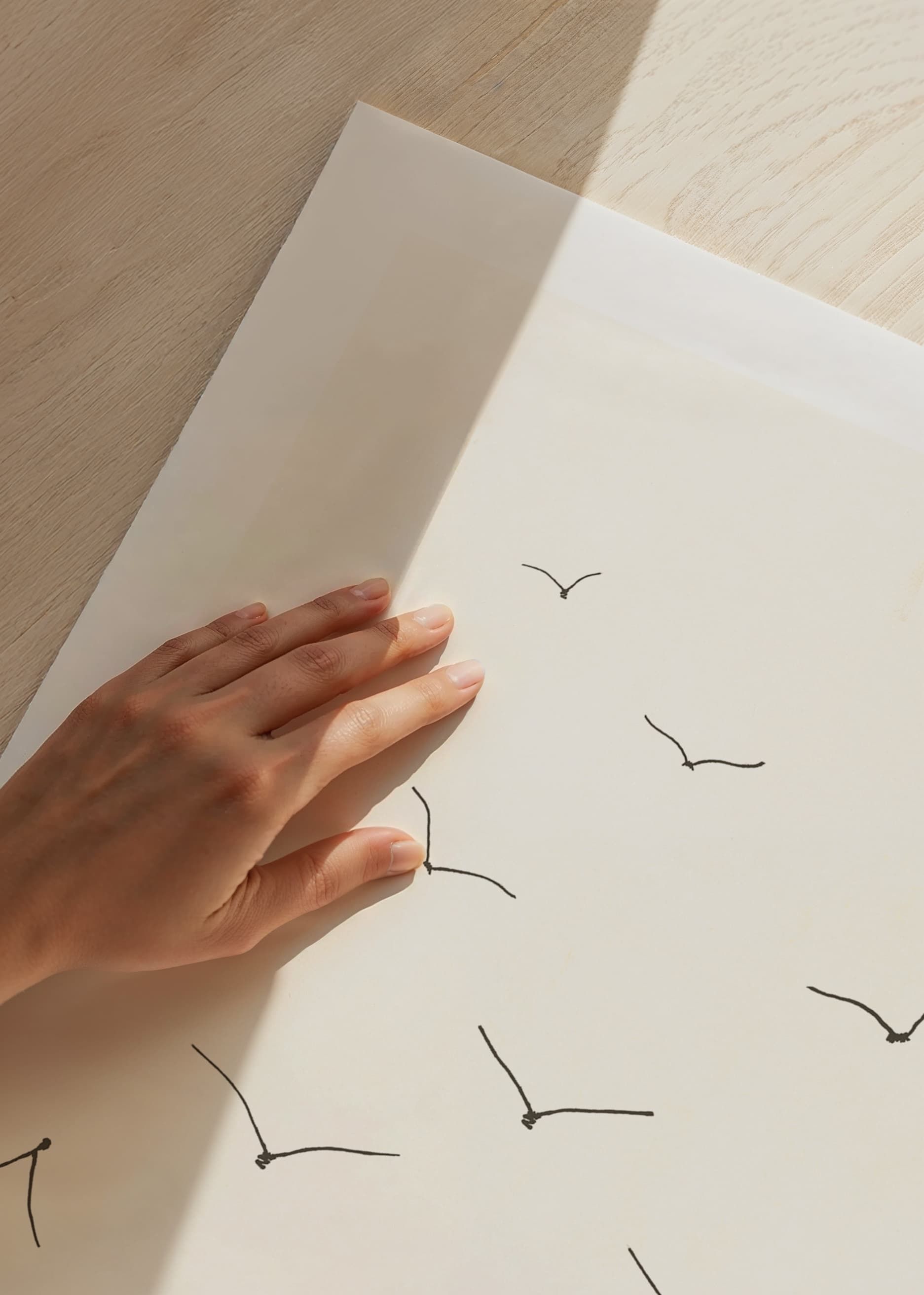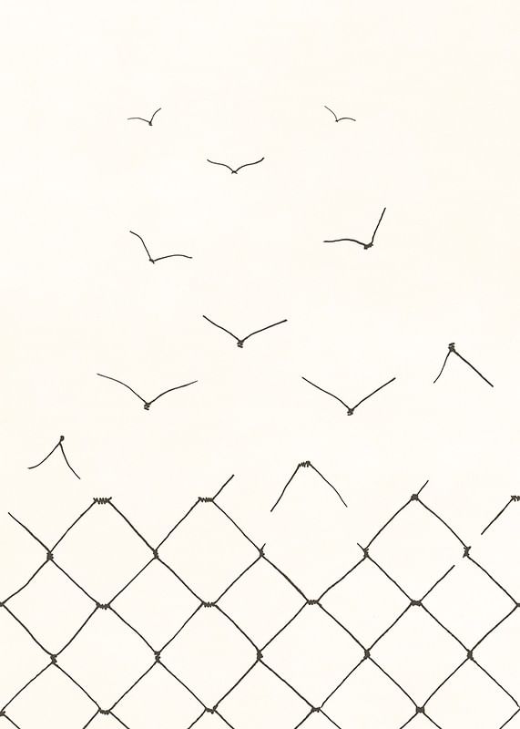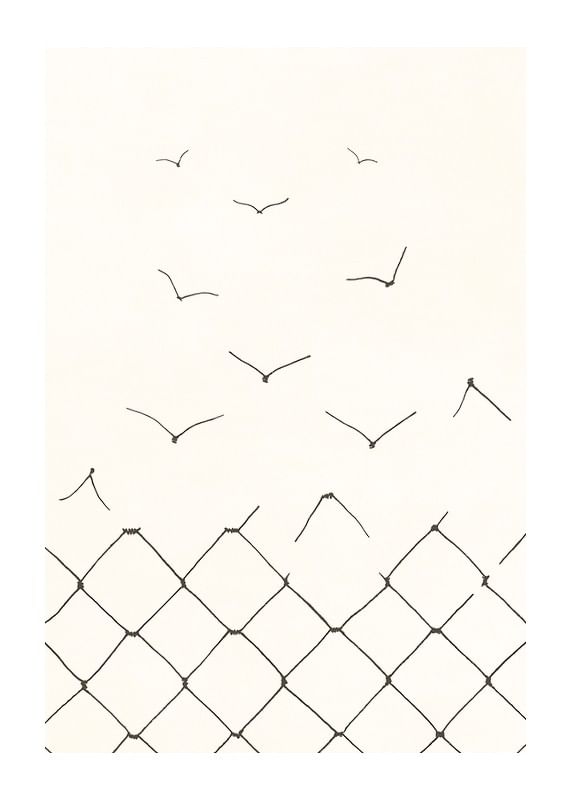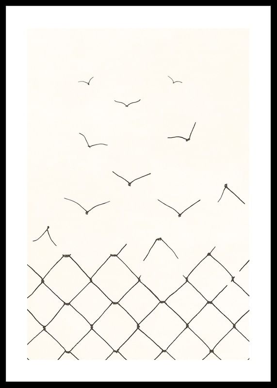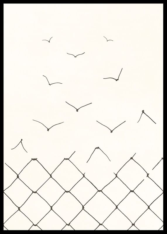 Le motif représente une clôture noire, dont plusieurs fils se transforment en silhouettes d'oiseaux s'envolant vers la liberté sur un fond clair. Le dessin au trait minimaliste crée une impression d'ouverture et traduit le sentiment de lâcher prise. L'affiche confère une tonalité réfléchie à la maison ou au bureau.