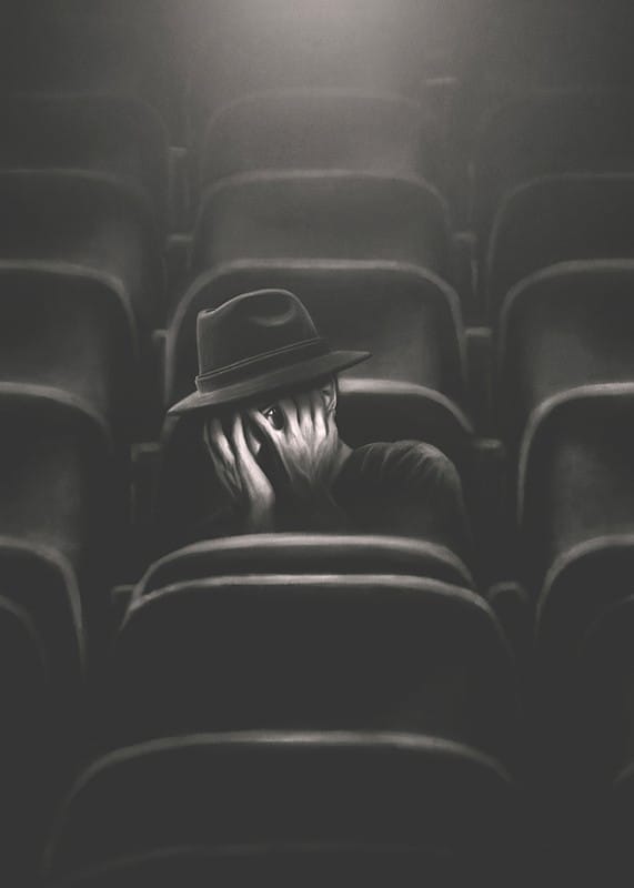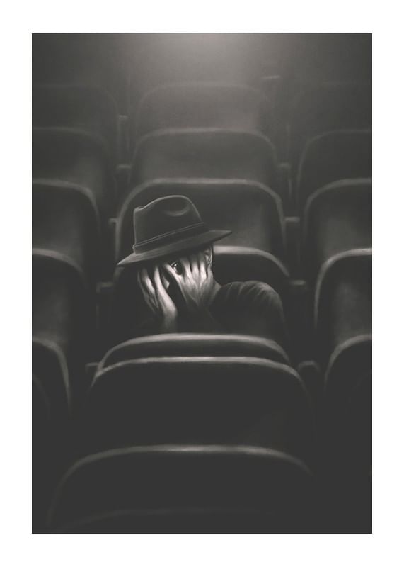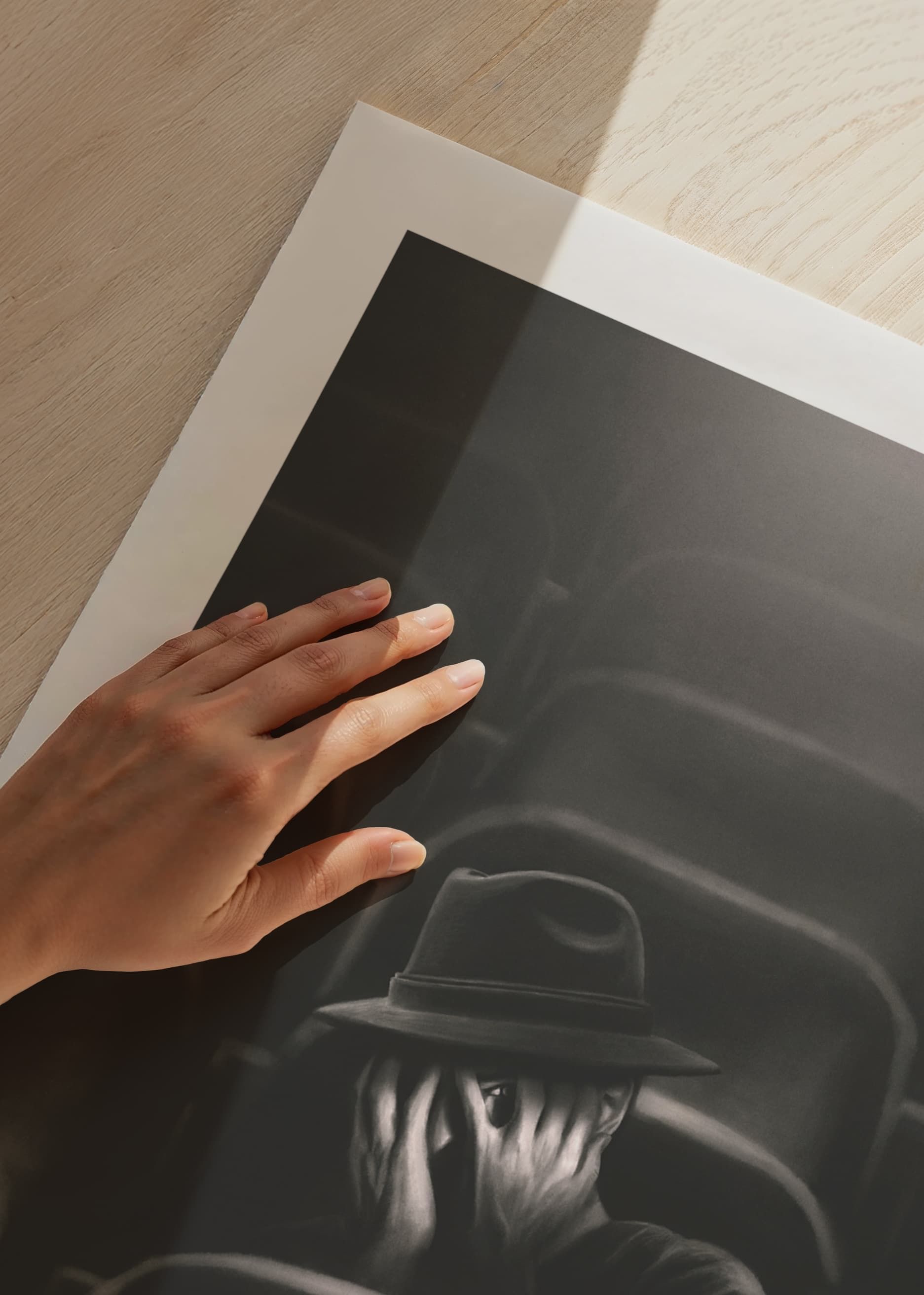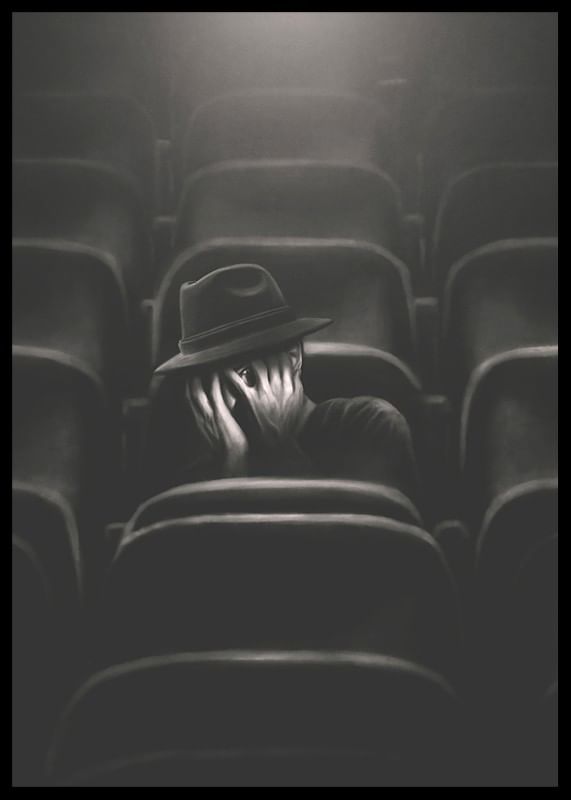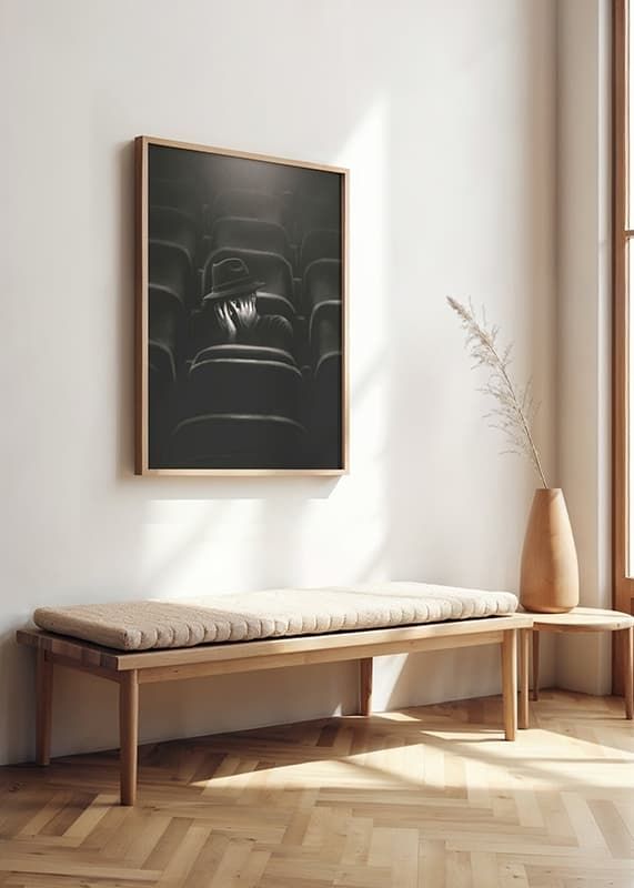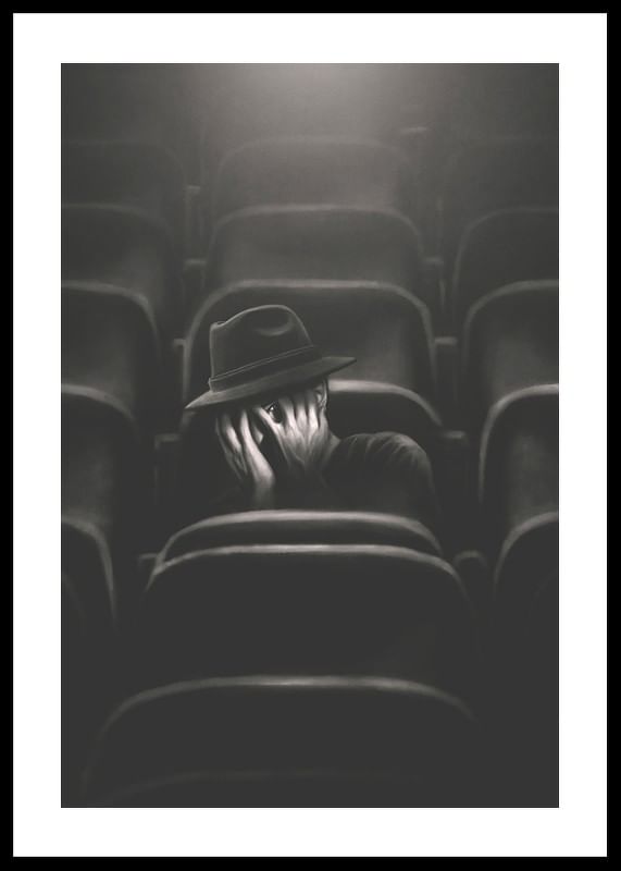 Un homme seul est assis parmi des rangées de sièges vides dans une salle de cinéma faiblement éclairée, le visage caché dans ses mains. Les tons gris discrets et l'éclairage subtil du motif créent une impression d'isolement et de tension. Avec son expression conceptuelle, cette affiche est un ajout intéressant à un salon, un bureau ou une entrée.