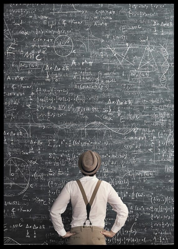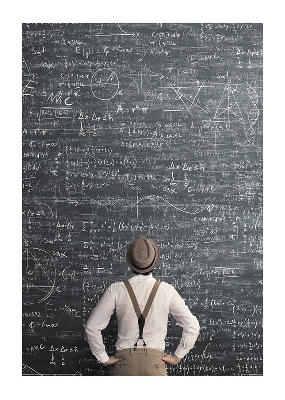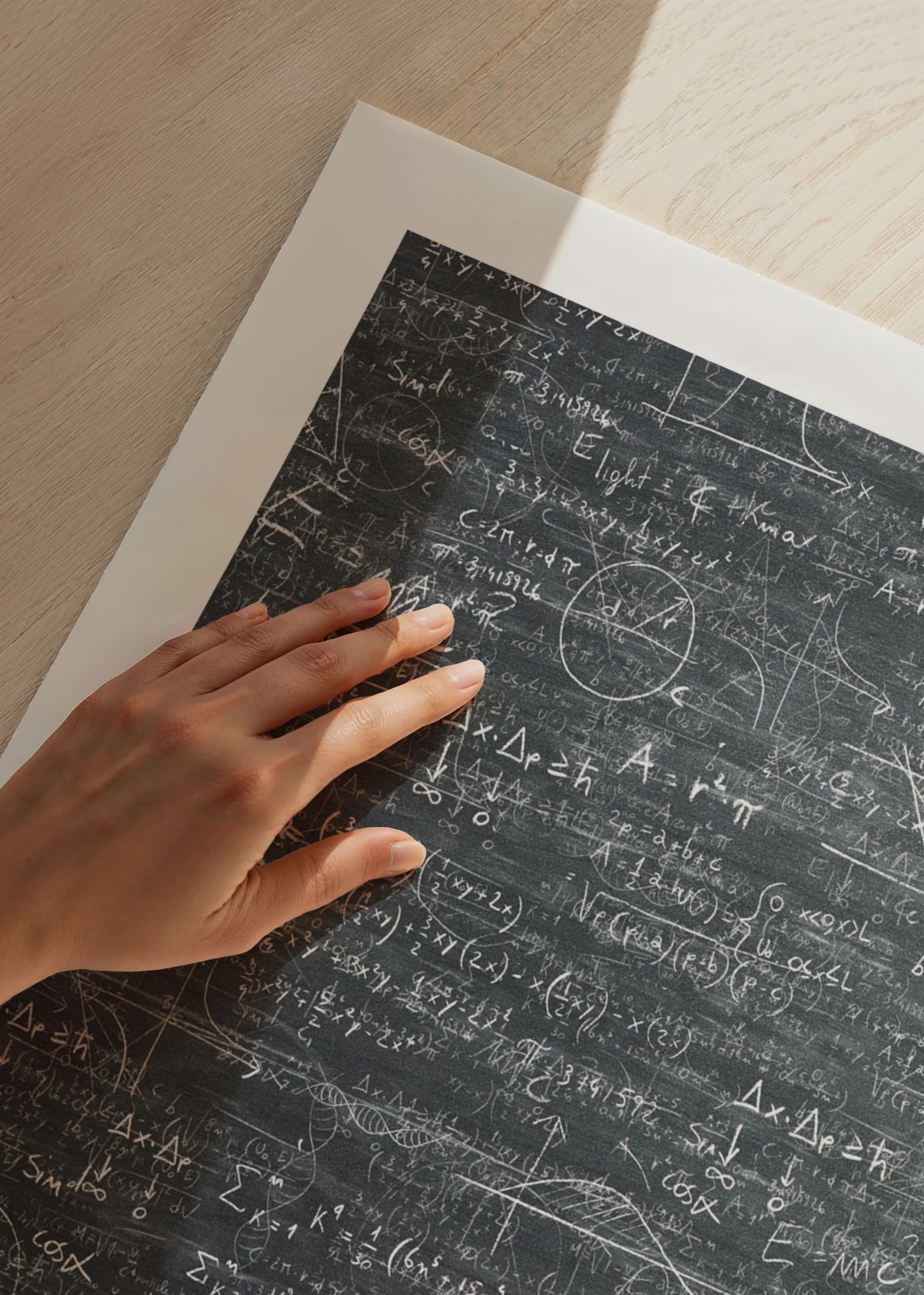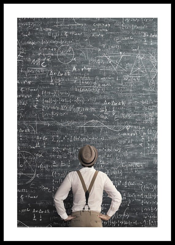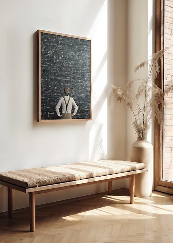 Un homme en chemise, bretelles et chapeau se tient debout devant un tableau noir mural rempli de formules mathématiques, d'équations et de diagrammes. La palette de couleurs noir et blanc et le motif analytique incitent à la réflexion. Cette affiche est idéale pour les salles d'étude, les bureaux ou les environnements créatifs où l'inspiration et l'intellect sont mis en avant.