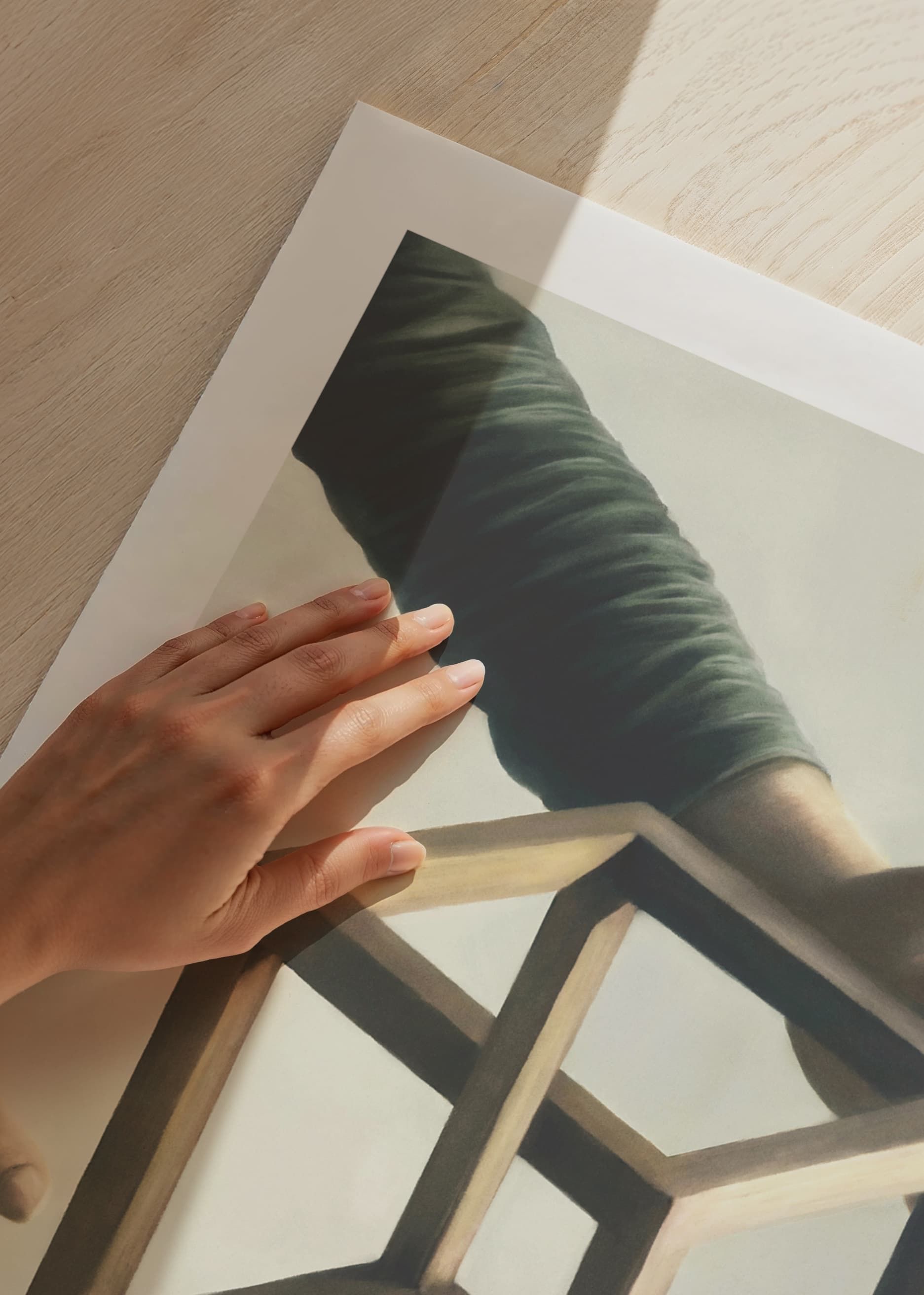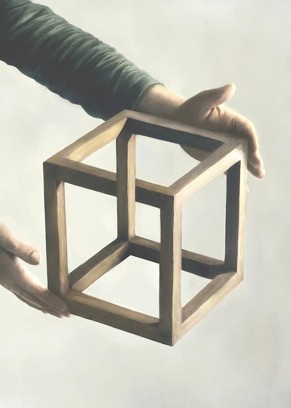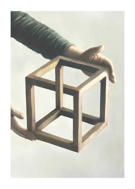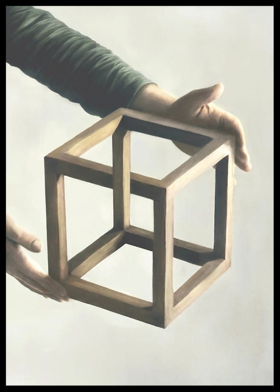 Le motif représente deux mains tenant délicatement un cube en bois à la géométrie impossible, sur un fond doux et lumineux. Le style illustré, avec ses subtils dégradés de couleurs, confère à l'affiche une expression moderne et conceptuelle. Un élément propice à la conversation, capable d'embellir un espace de travail ou un salon élégant.