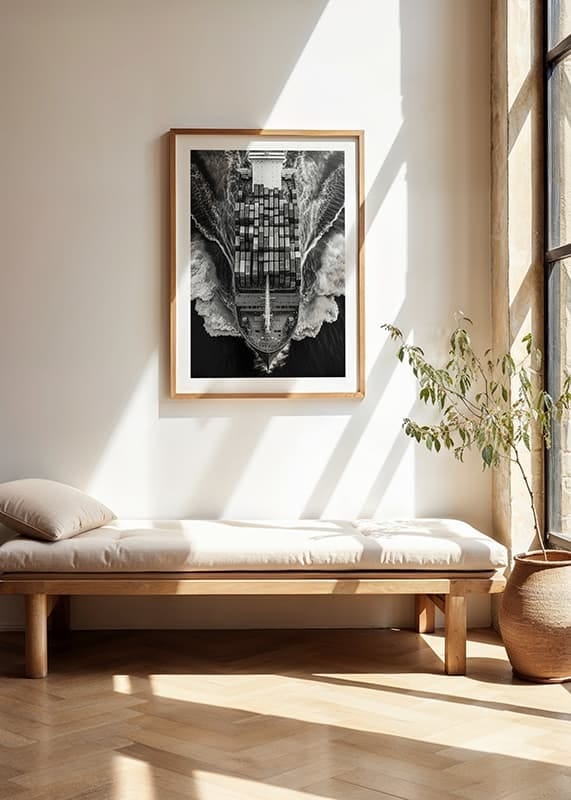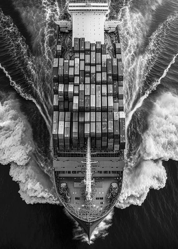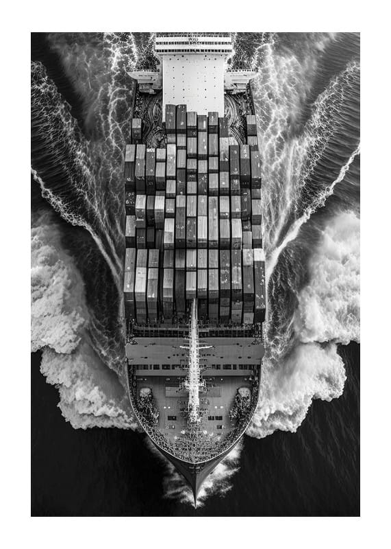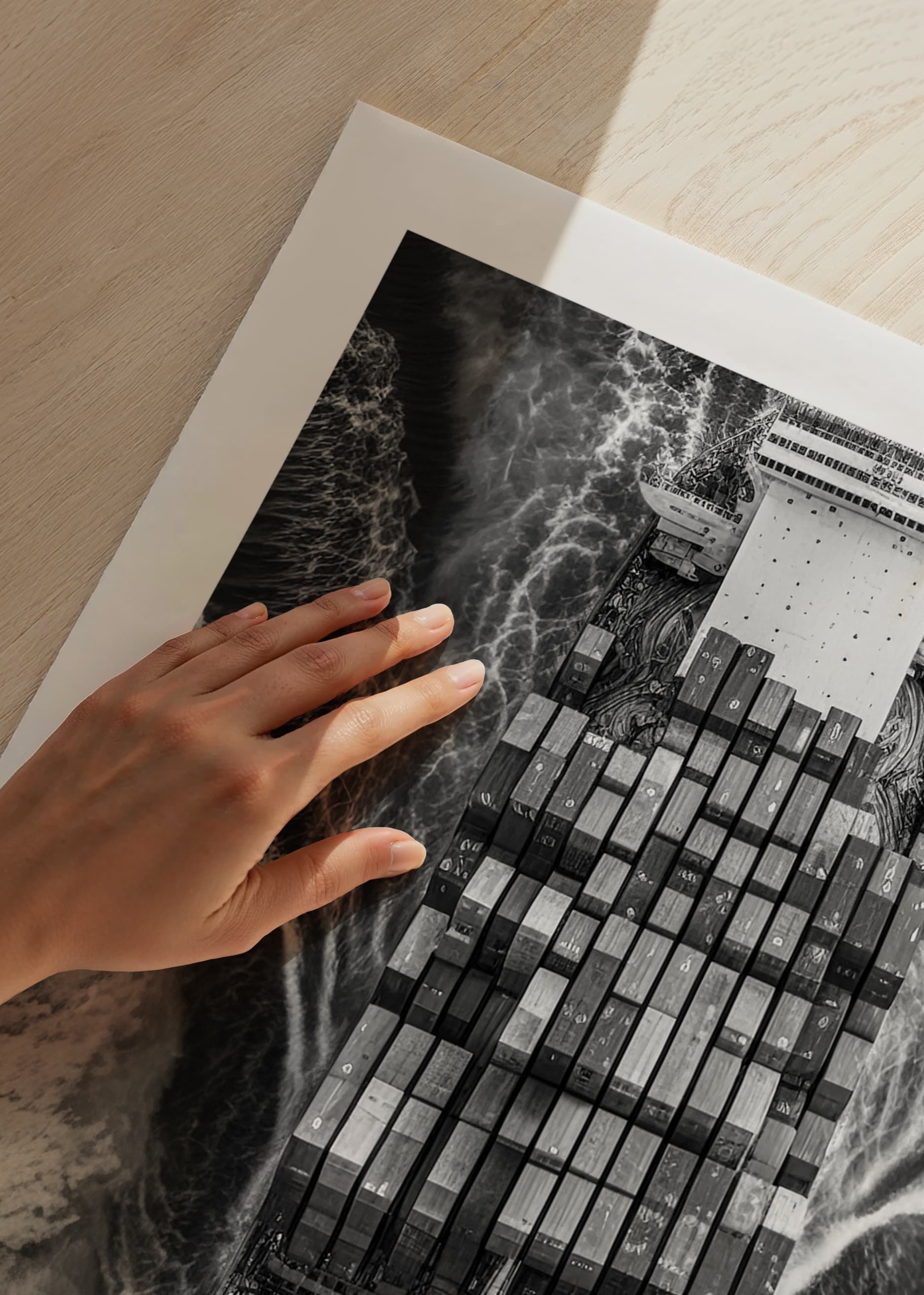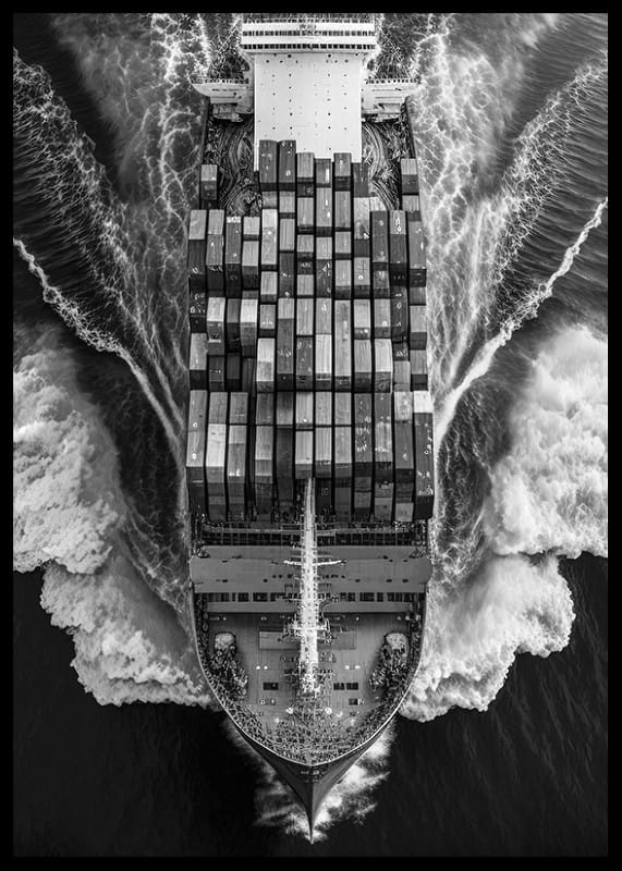 Vue aérienne d'un grand porte-conteneurs naviguant sur l'eau, capturée dans de saisissants contrastes noir et blanc. Les lignes puissantes de la coque et les vagues entourent les conteneurs empilés sur le pont. Cette affiche dégage une impression industrielle et puissante qui peut créer une atmosphère unique, par exemple dans un bureau ou un couloir.
