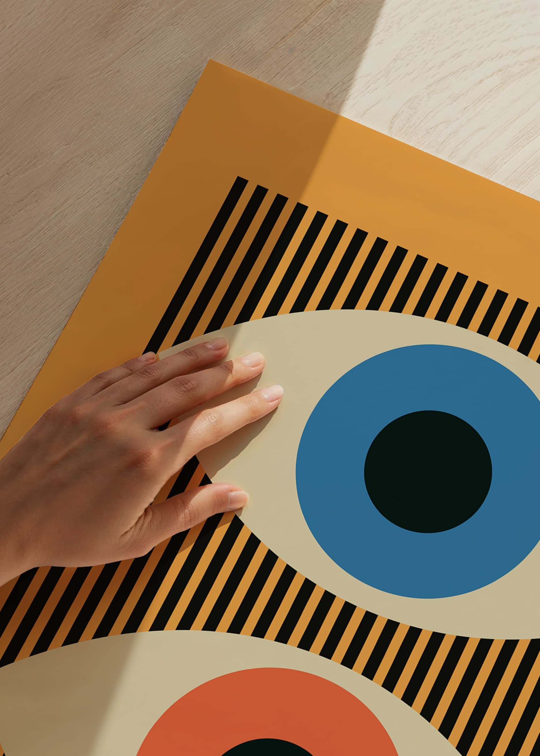 Bauhaus Eyes No1 est une élégante affiche inspirée du mouvement Bauhaus, l'influente école de design allemande qui a ouvert la voie à l'art, à l'architecture et au design modernes au XXe siècle. Avec son style distinctif, ses lignes épurées et son expression créative, ce motif capture le style Bauhaus, véritable référence historique. Idéal pour ceux qui souhaitent apporter une touche de design historique et de créativité intemporelle à leur intérieur.