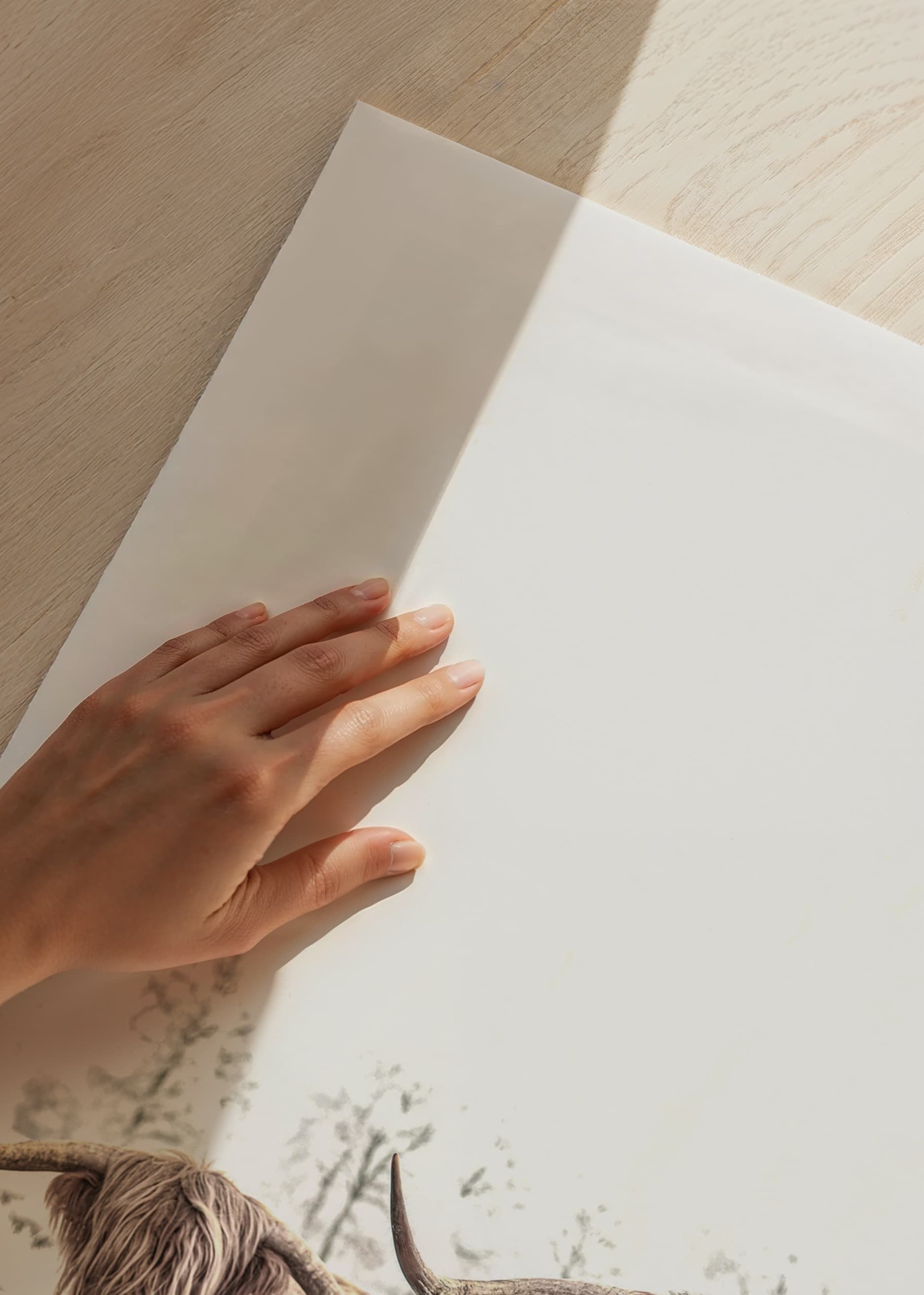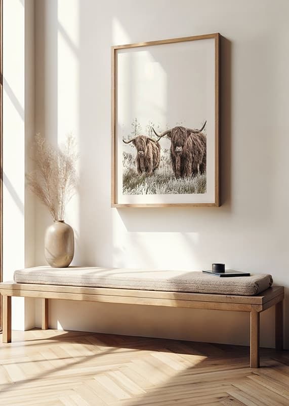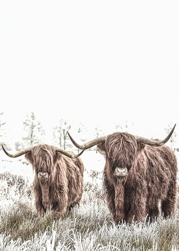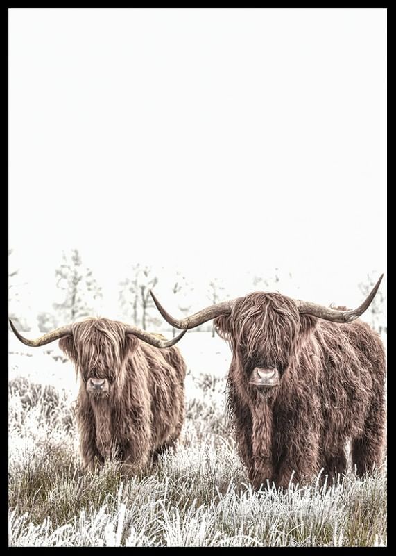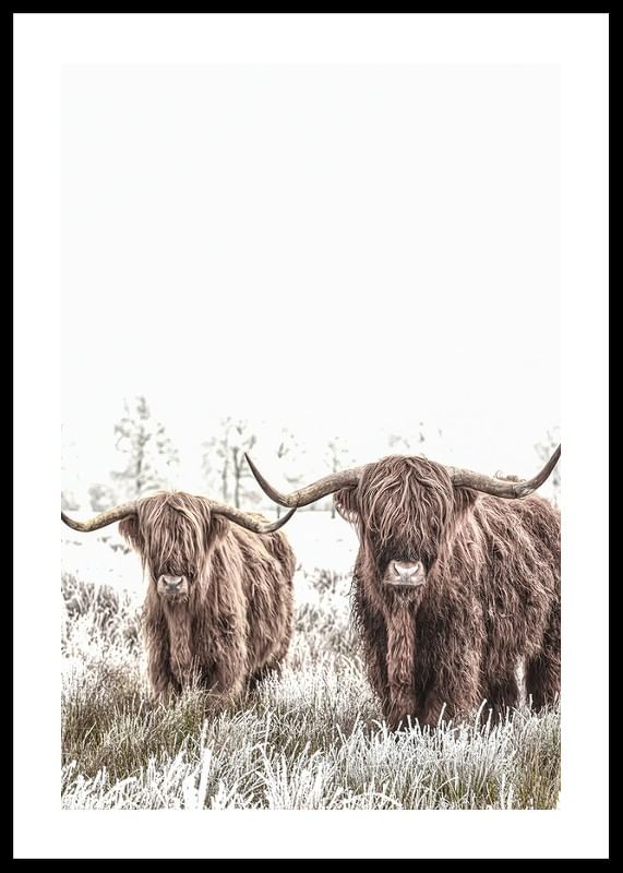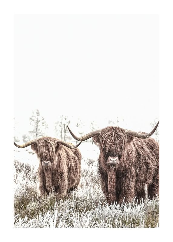 Deux vaches des Highlands écossaises aux longues cornes et à la fourrure épaisse se tiennent côte à côte dans un pré gelé. Les tons bruns chauds des vaches contrastent avec le paysage hivernal lumineux, presque blanc, en arrière-plan. Cette affiche est parfaite pour les intérieurs recherchant des motifs naturels et des éléments rustiques.