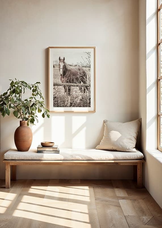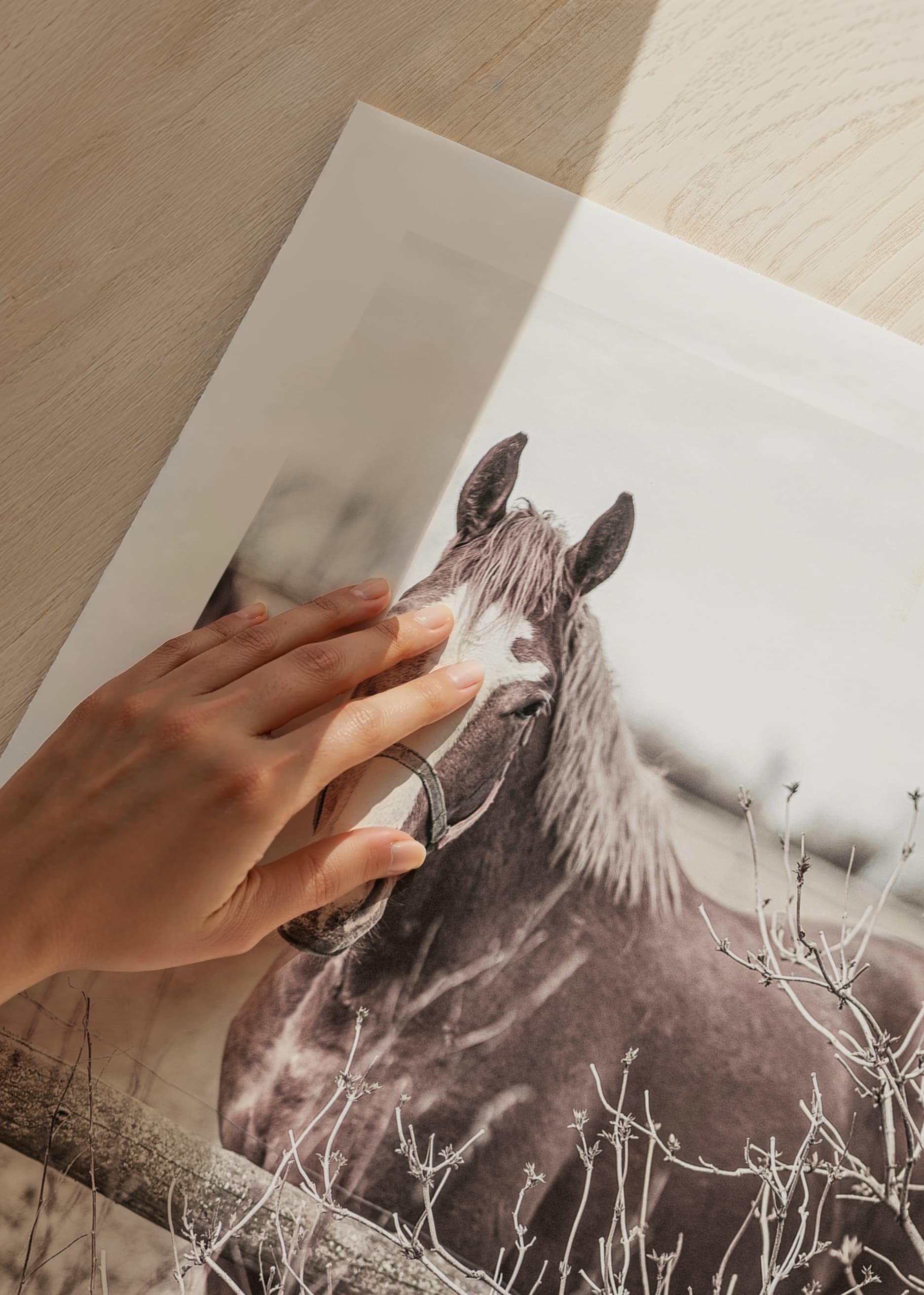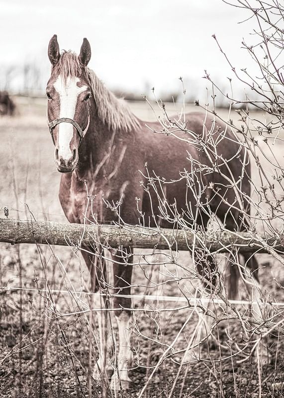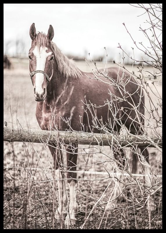 Un cheval brun à la ligne blanche se tient tranquillement derrière une simple clôture en bois, dans un pâturage ouvert. Des branches aux brindilles fines masquent partiellement le sujet, et l'arrière-plan arbore des tons terreux doux et discrets. Cette affiche évoque la sérénité de la campagne et convient aussi bien aux salons qu'aux bureaux.