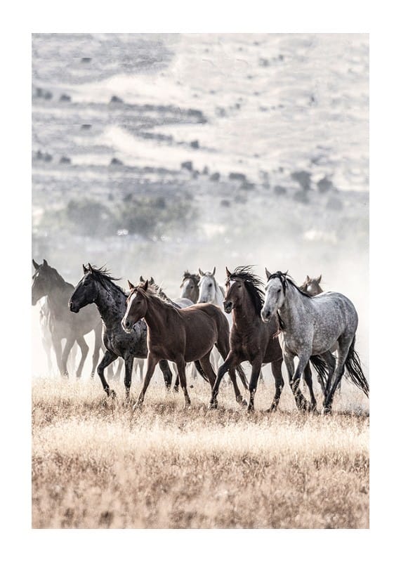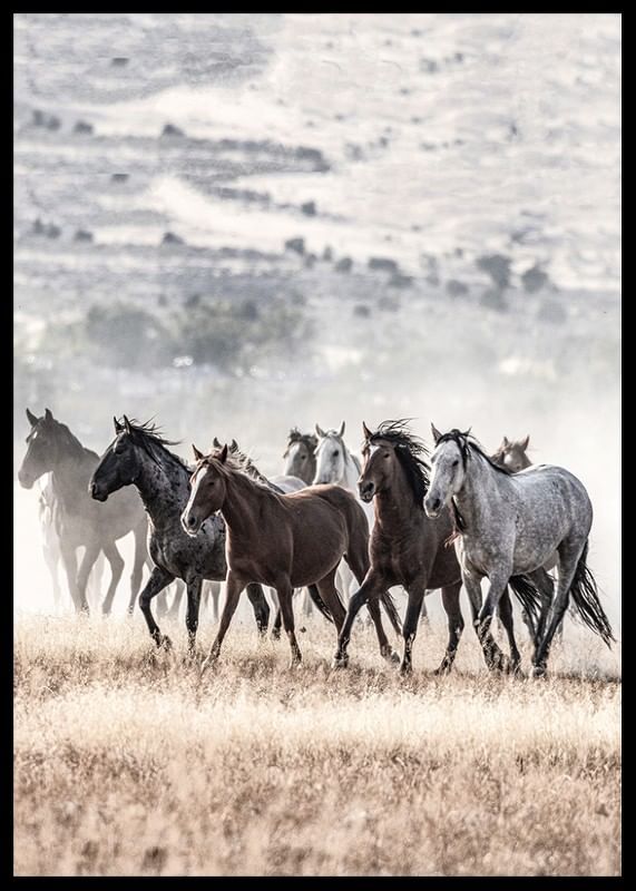 Un troupeau de chevaux sauvages avance à travers un champ ouvert et ensoleillé. La poussière recouvre le sol, créant un doux contraste avec la fourrure des chevaux aux nuances de brun, de gris et de noir. Le fond flou renforce l'impression de liberté. Cette affiche crée une ambiance naturelle et vivante dans votre intérieur.