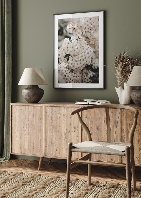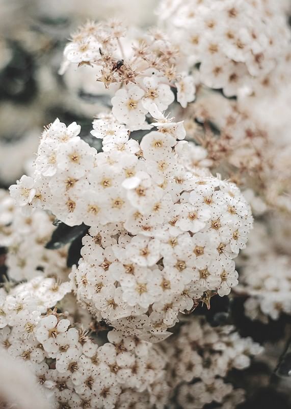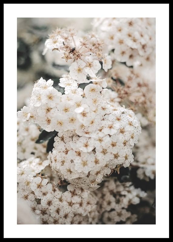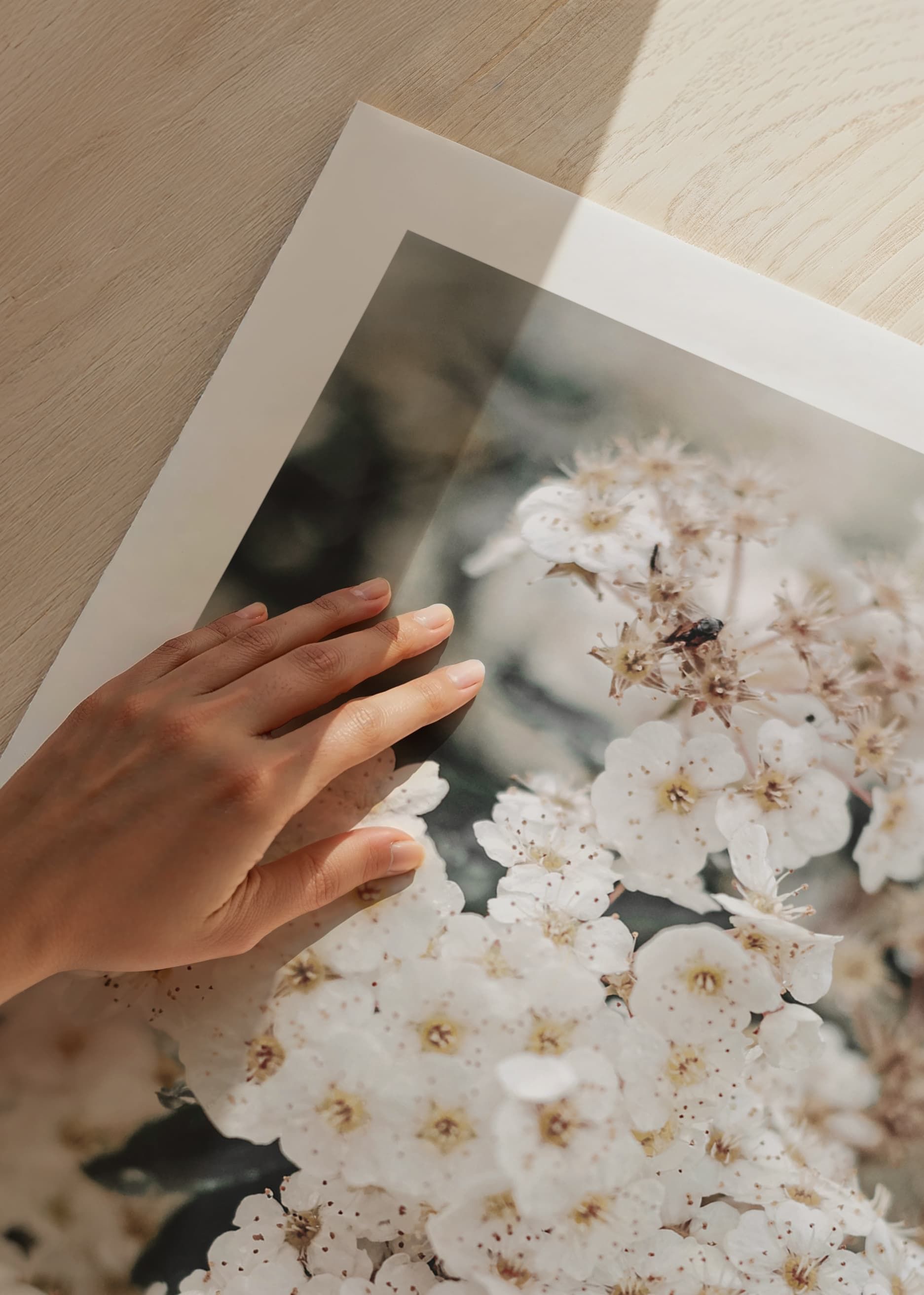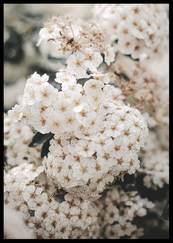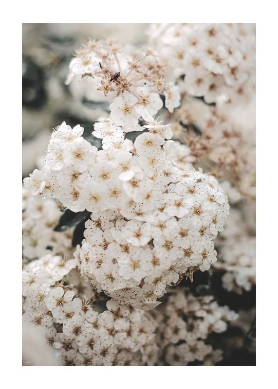 Des grappes de petites fleurs printanières blanches, disposées en transparence, sont mises en valeur, entourées d'étamines jaunâtres et de feuilles vertes discrètes. L'arrière-plan flou et discret crée une expression douce et naturelle qui met en valeur les détails des fleurs. Cette affiche botanique contribue à une ambiance lumineuse et lumineuse dans votre intérieur.