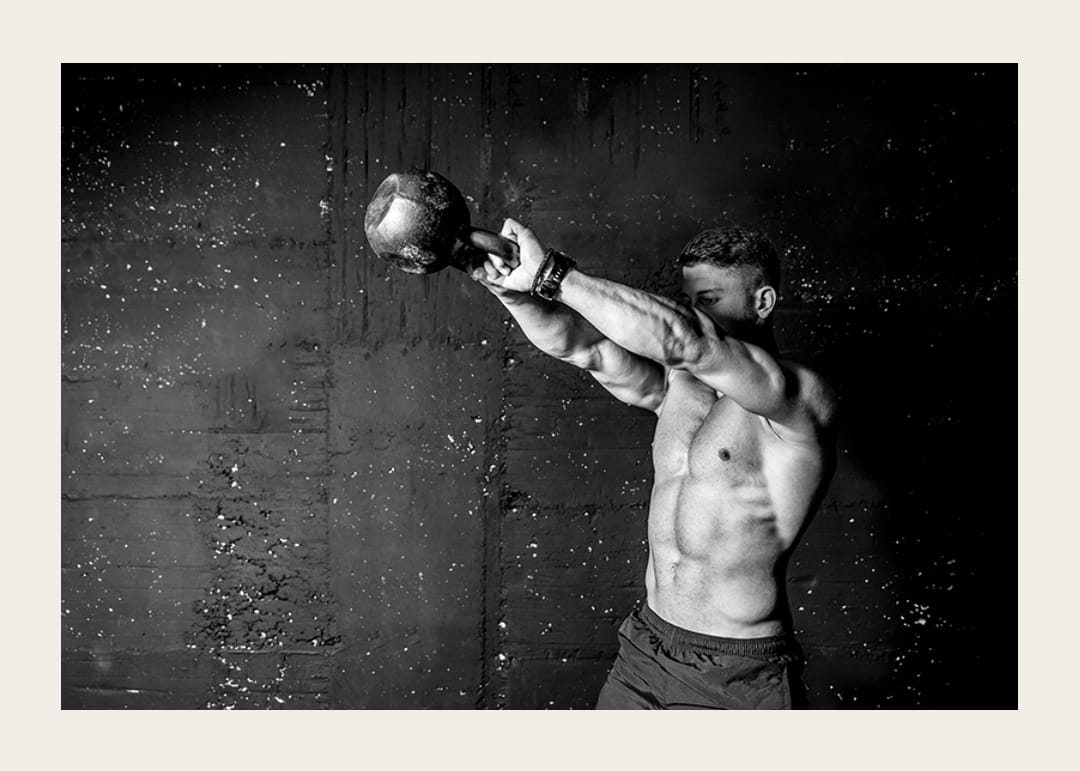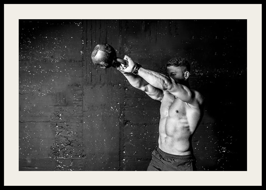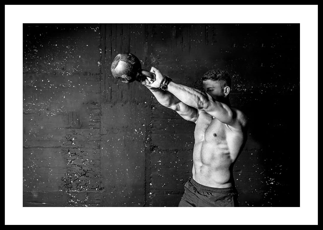 Un homme athlétique effectue un exercice avec kettlebell dans une posture puissante contre un mur de béton brut et sombre. Les ombres soulignent la musculature, tandis que l'expression en noir et blanc confère au sujet une impression brute et minimaliste. Cette affiche est parfaite pour les salles de sport, les home-trainers ou les espaces de fitness modernes.