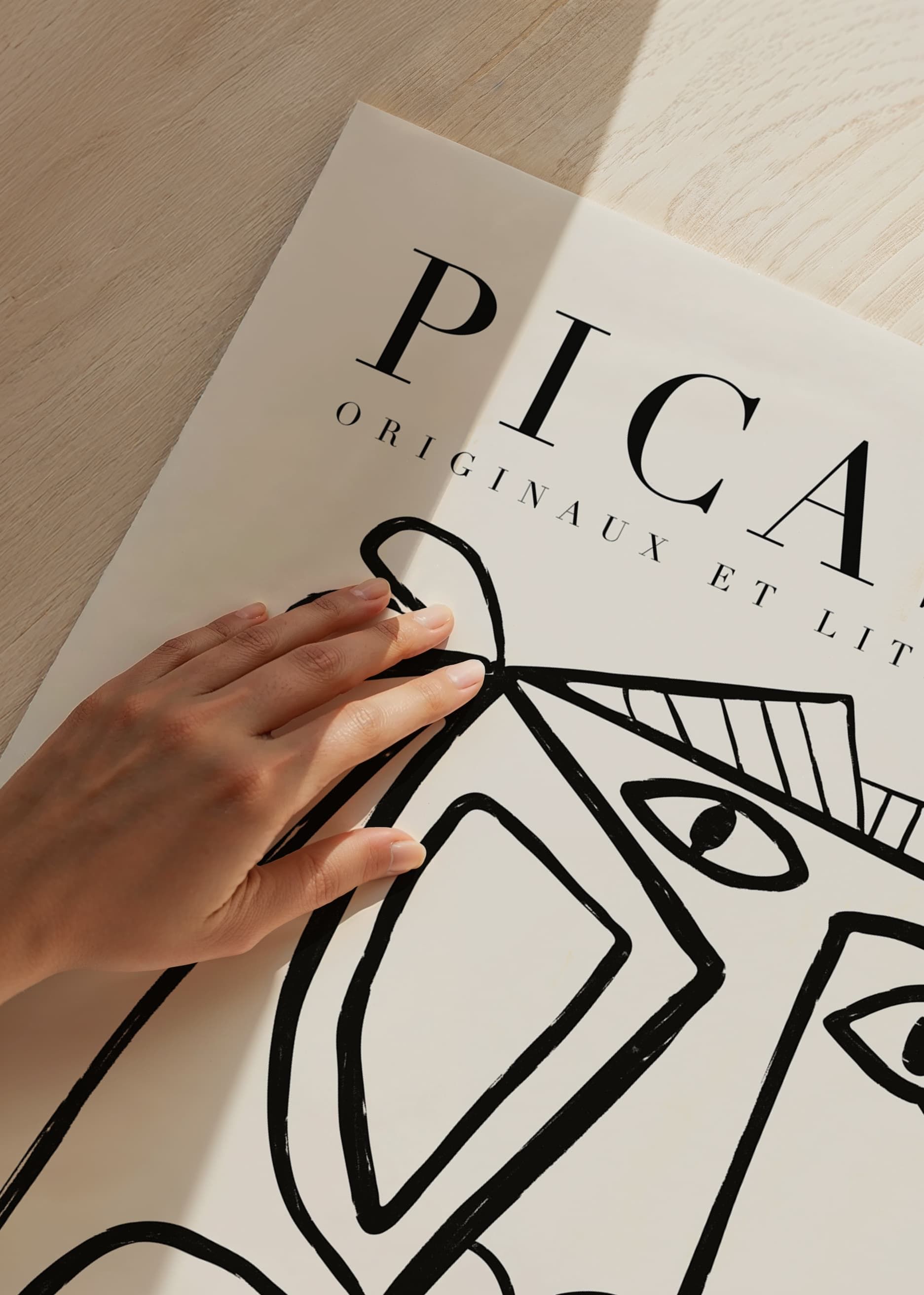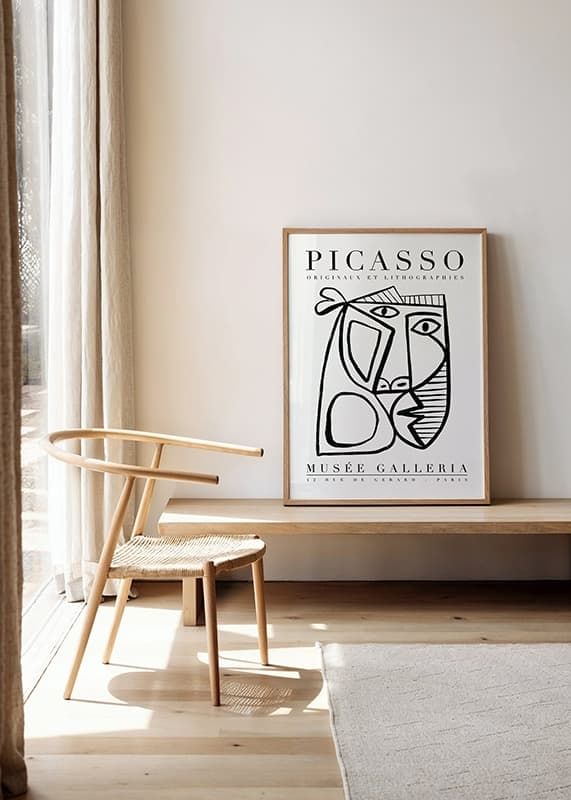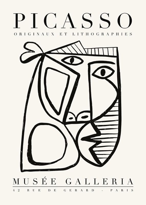 Visage cubiste abstrait en noir sur fond clair, composé de lignes épurées et de formes graphiques simples. Le texte au-dessus du motif fait référence au maître espagnol Pablo Picasso et au Musée Galleria de Paris, ce qui confère à l'affiche une dimension artistique. Picasso fut l'un des artistes les plus influents du XXe siècle et le fondateur du cubisme. Convient aux pièces où le modernisme classique et l'art élégant sont recherchés, et apporte une touche intemporelle.