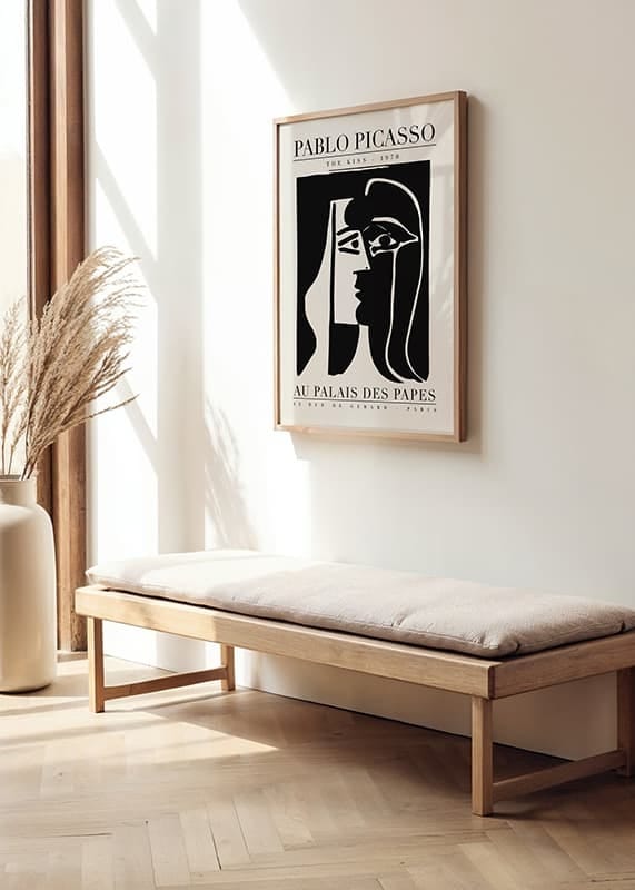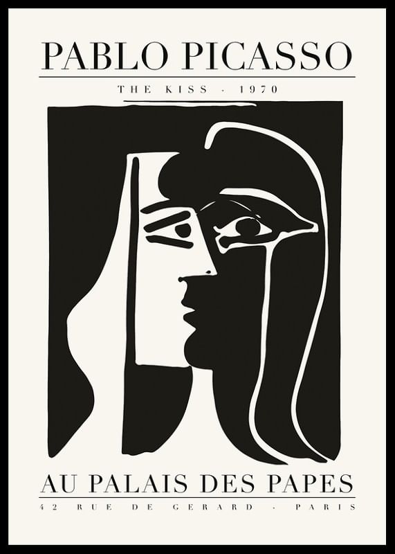 Le motif représente un visage abstrait en noir et blanc, où deux profils se rencontrent pour former une composition unifiée, dans le style caractéristique du maître espagnol Pablo Picasso. Des lignes claires et des contrastes simples confèrent à l'affiche une touche artistique et graphique. Idéale pour un salon ou un bureau où l'inspiration artistique est recherchée. Picasso est considéré comme l'un des artistes les plus influents du XXe siècle.