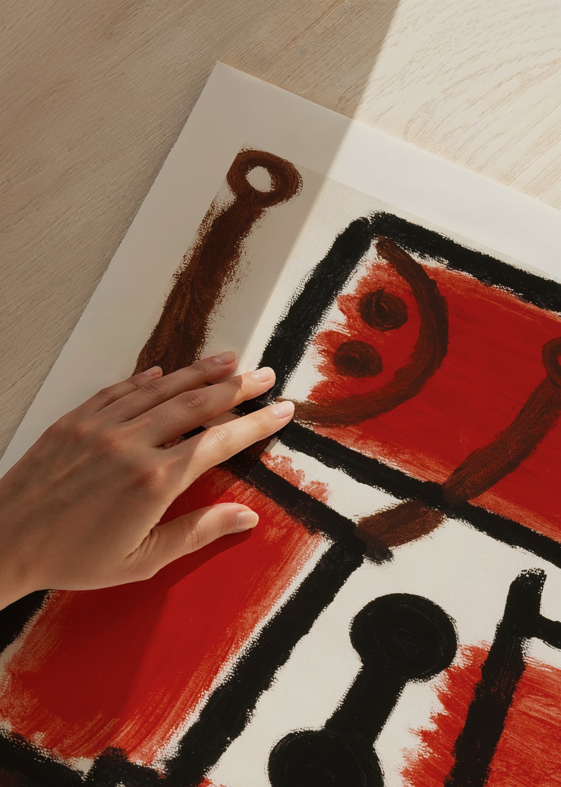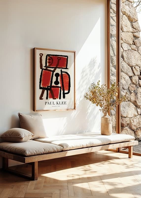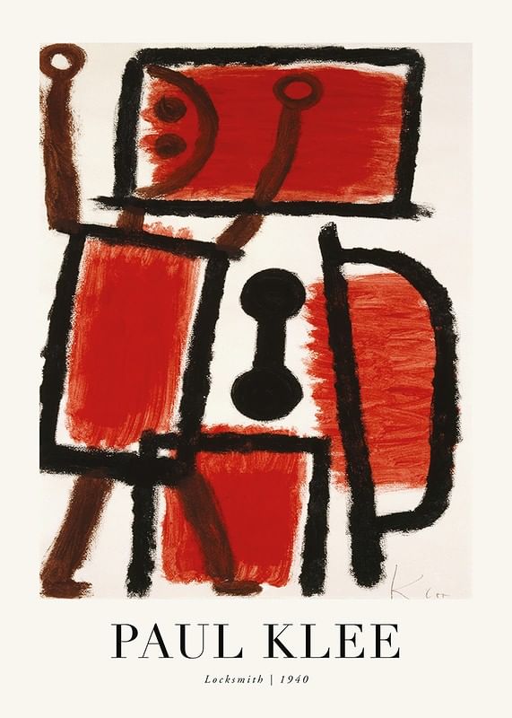 Des formes géométriques rouges et noires dessinent une figure abstraite sur un fond clair, typique du style tardif de Paul Klee. Lignes rigides et cercles organiques s'entremêlent dans le motif. L'artiste suisse-allemand, l'un des pionniers du modernisme, est connu pour son travail novateur sur la théorie des couleurs, qui caractérise cette affiche artistique et stimulante sur le plan intellectuel – un choix idéal pour les amateurs d'esthétique moderne.