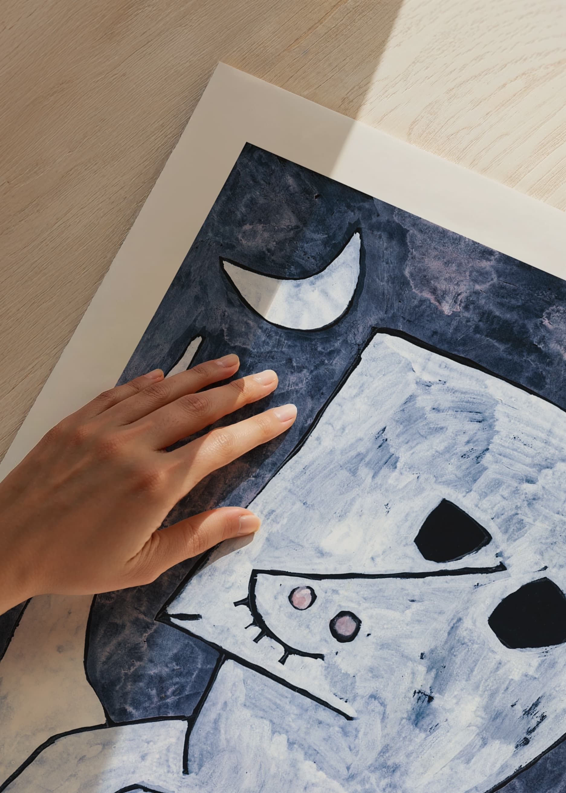 Le motif représente une figure abstraite à la tête carrée, aux yeux noirs proéminents et aux ailes, réalisée dans des tons bleus et gris discrets. Un croissant de lune apparaît en arrière-plan, créant un contraste graphique. Le style d'époque confère à cette affiche de l'artiste suisse-allemand, l'un des pionniers du modernisme et connu pour son influence sur la théorie des couleurs, un intérêt pour les intérieurs modernes comme classiques, notamment ceux où l'art occupe une place centrale.