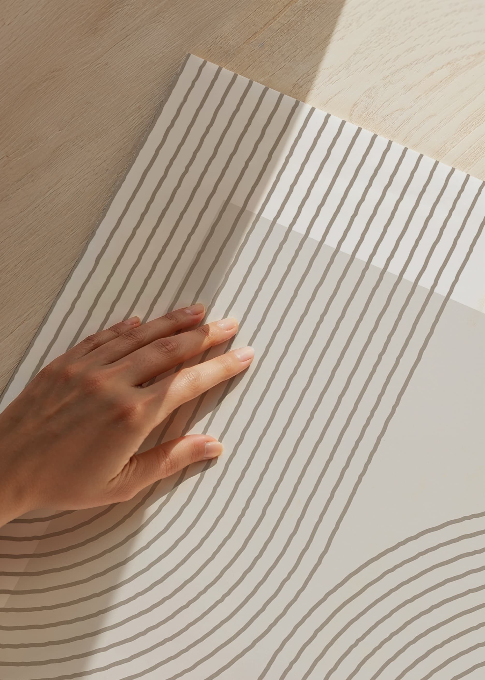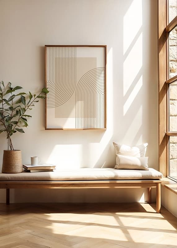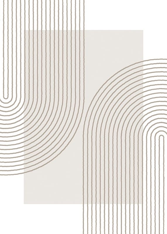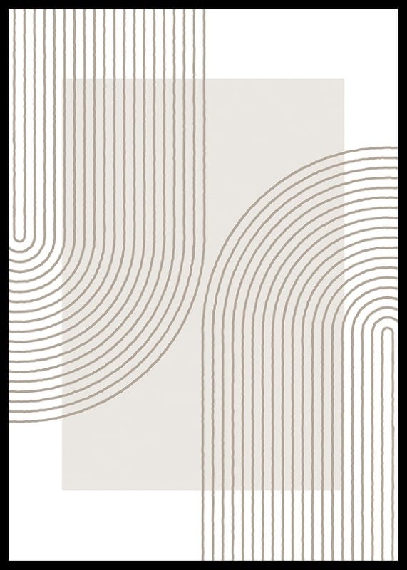 Des lignes droites et courbes beiges forment deux grands arcs qui se rejoignent sur un carré clair en arrière-plan. Le style simple et graphique et les tons terreux doux lui confèrent une expression moderne. Cette affiche sublimera facilement un salon, un bureau ou une entrée grâce à son motif minimaliste et contemporain.