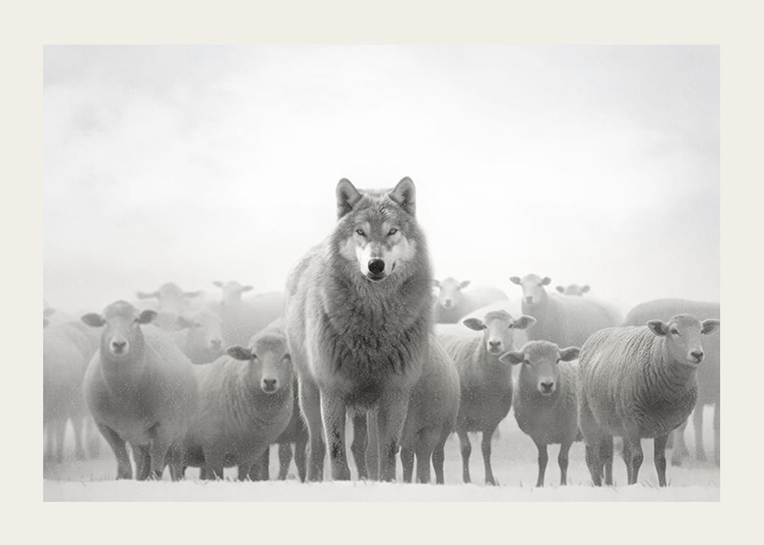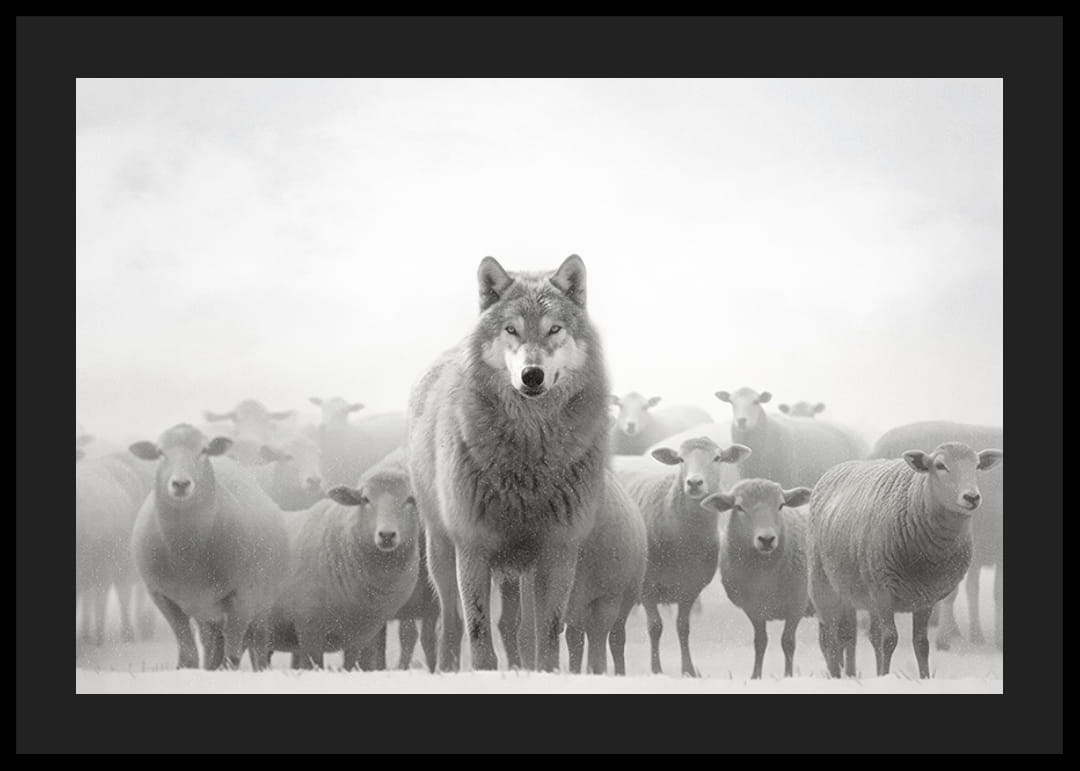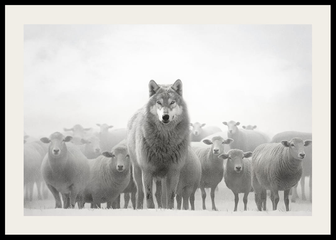 Au milieu d'un troupeau de moutons, un loup se tient debout, le regard fixé sur le spectateur. La palette monochrome de gris et de blanc renforce l'atmosphère apaisante, tandis que le brouillard adoucit l'arrière-plan. Ce motif offre un contraste subtil et est idéal pour engager la conversation dans les pièces où l'affiche sera exposée.