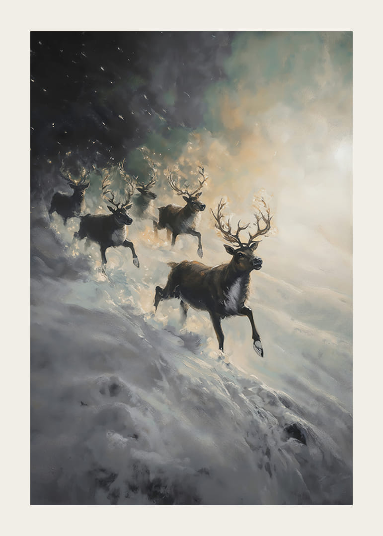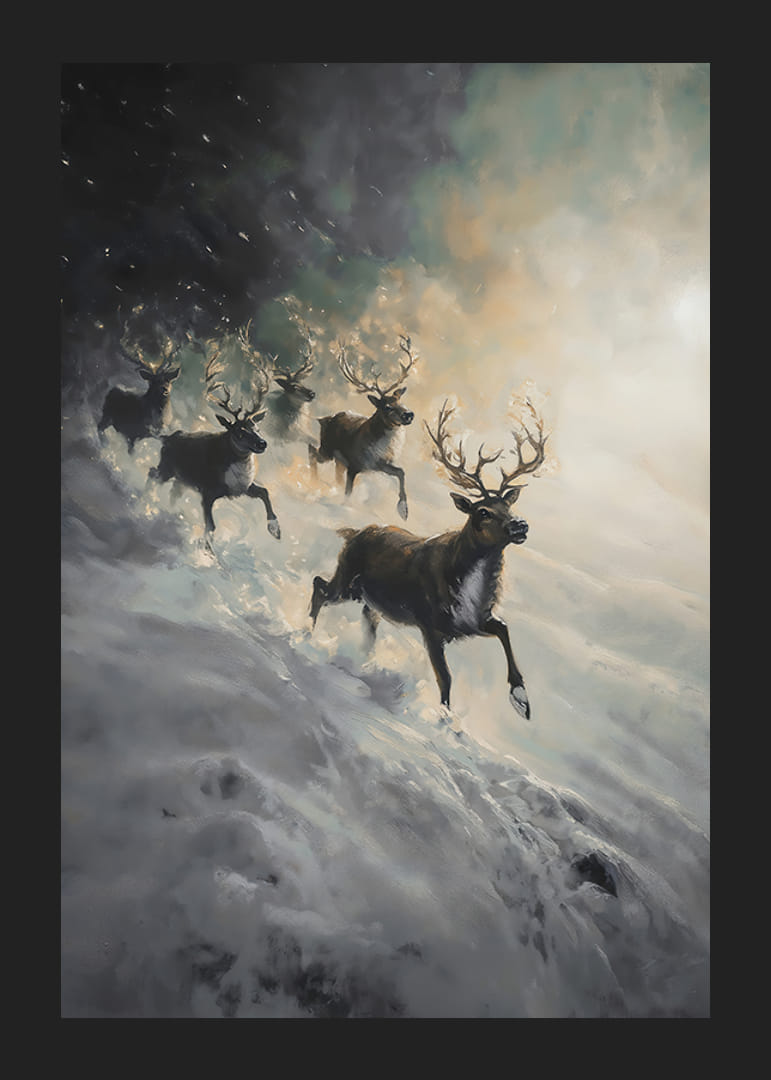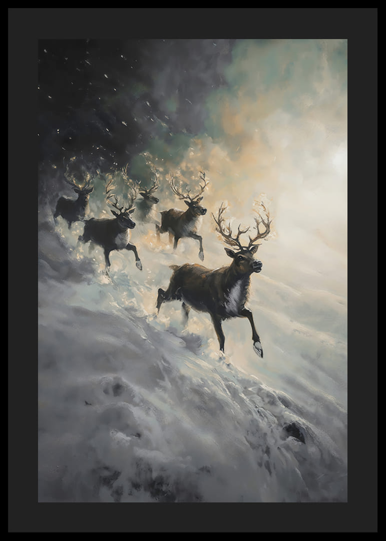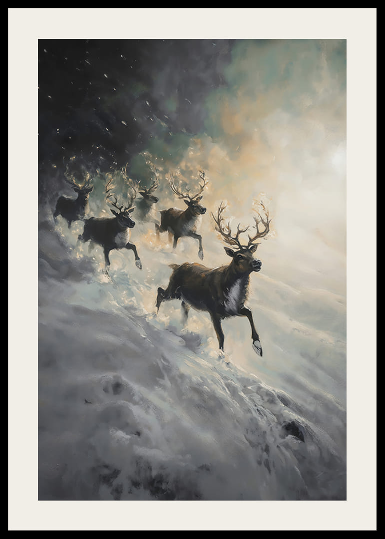 Remplissez votre maison de drame et de mystère hivernal avec cette affiche impressionnante représentant un troupeau de rennes dévalant une pente enneigée, entouré de brume et de lumière douce. L'image capture la puissance de la nature et la beauté brute du paysage nordique, où les rennes apparaissent comme de majestueux symboles de liberté et de force. Parfait pour créer un sentiment d’aventure et d’élégance hivernale dans votre maison.